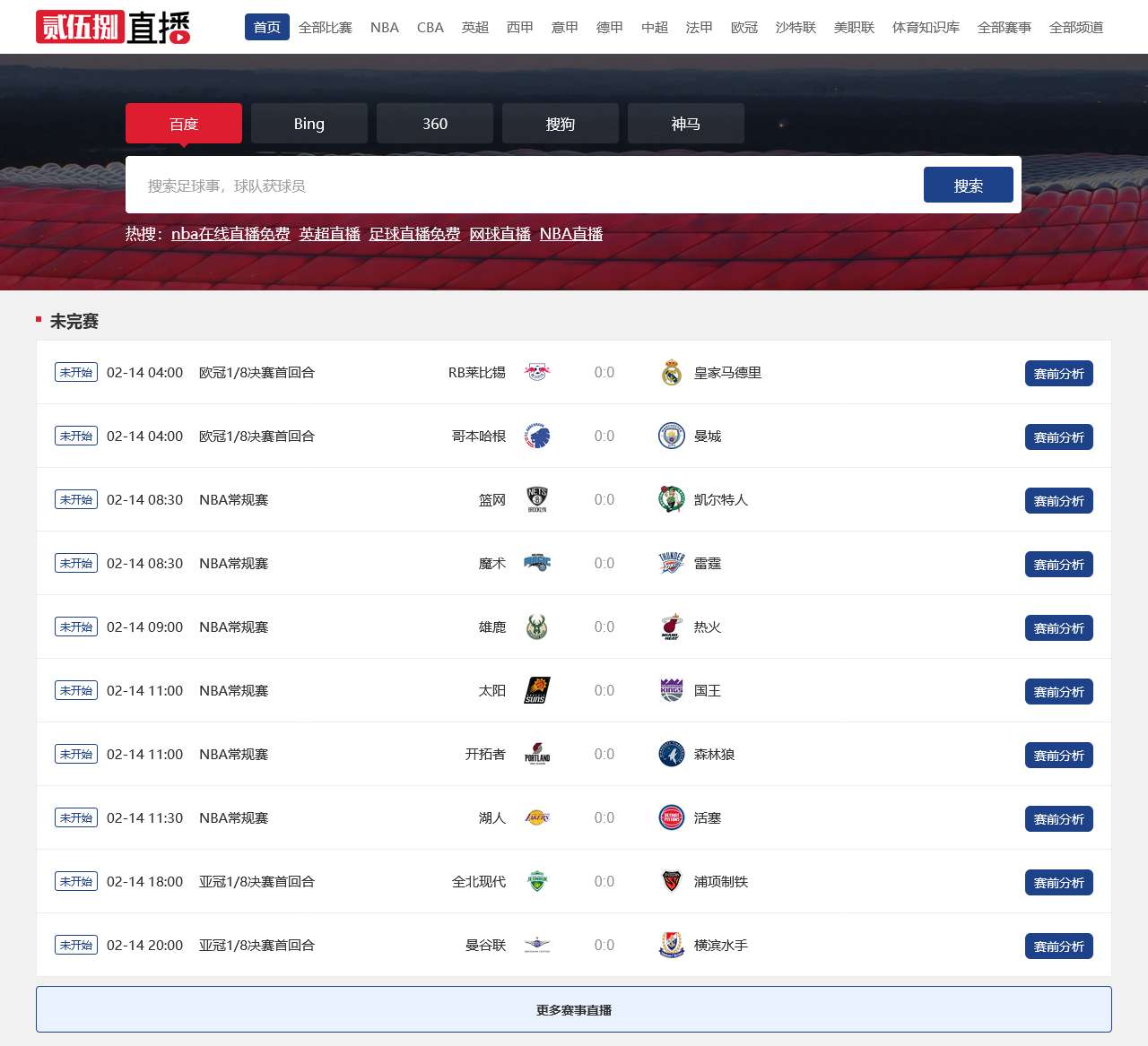 | 全部比赛 | NBA CBA 英超 西甲 意甲 德甲 中超 法甲 欧冠 沙特联 美职联 |
