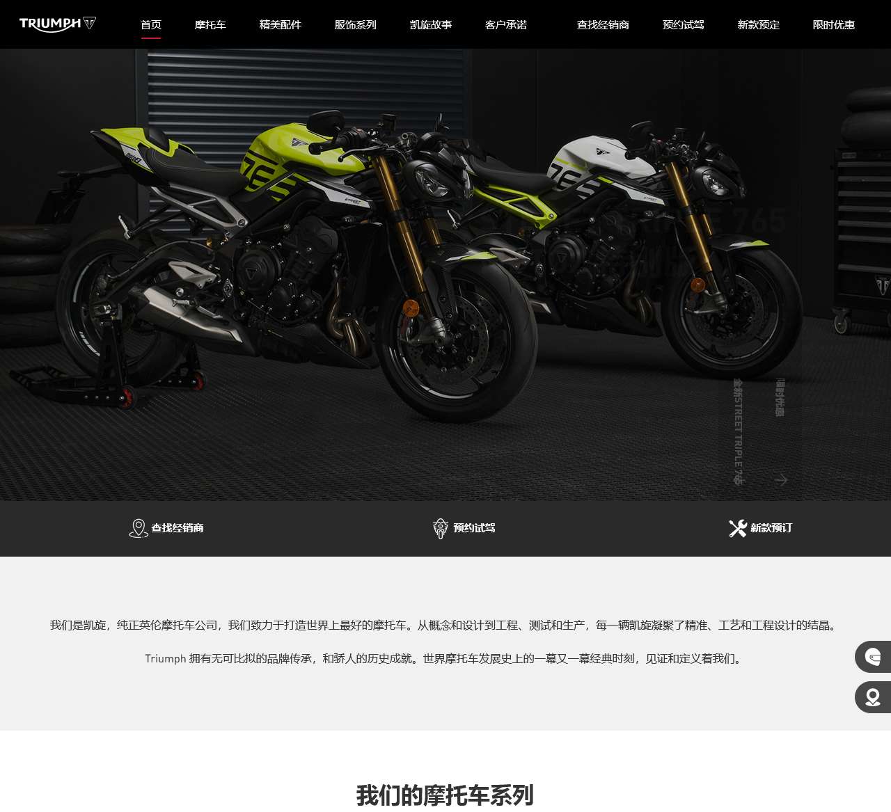 Triumph凯旋摩托中国官方网站提供丰富多样的摩托车系列,包括经典款式、限量版以及最新款式,满足不同骑手的需求和偏好。以下是网站首页提供的摩托车系列: