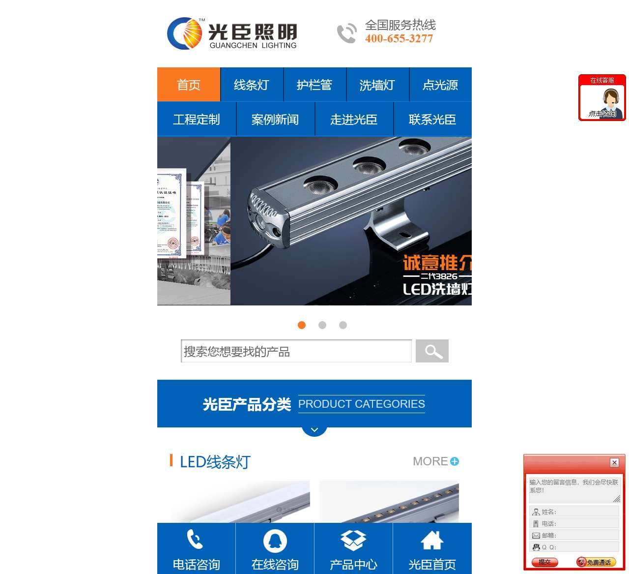 光臣照明是一家专业的LED灯具生产厂家,致力于为用户提供高品质的LED护栏管、LED线条灯、LED洗墙灯和LED点光源等产品。我们提供全国服务热线400-655-3277,为用户提供周到的服务和可靠的产品质量。