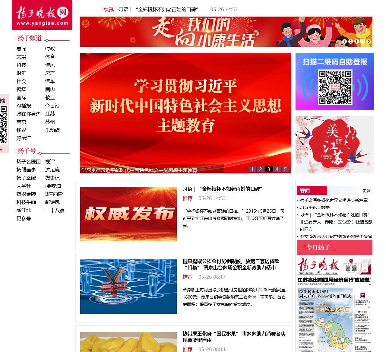 | 要闻 | 时政、文娱、体育、科技、诗风、财汇、房产、社会、汽车、聚场、国内、国际、教卫、AI播报、今日谈、政在你身边、江苏、南京、苏州、钱眼、乐动族、好房汇、扬子名医团、视评、扬眼画事、过足瘾、扬子鉴藏、微史记、大学升、i要辣油、夜娱金陵、B座西窗、科技牛咖、新诗风、新江北、二十八宿、更多号 |