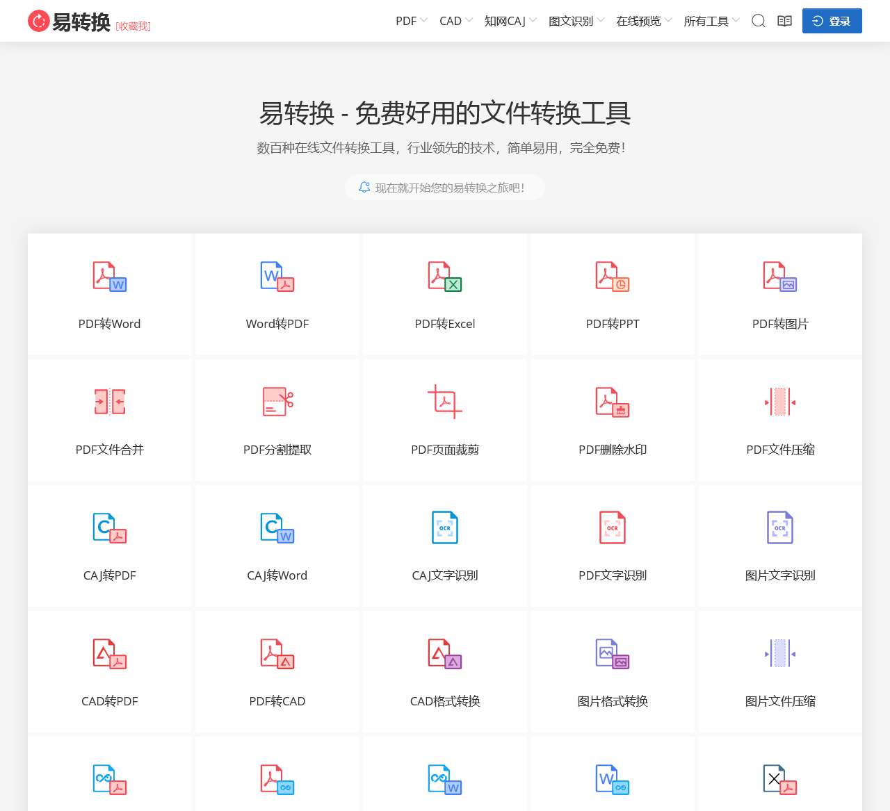 易转换是一个免费且功能强大的在线办公和学术文档转换工具,支持PDF、Word、Excel、PPT、知网CAJ、CAD等百余种常用文档的格式转换、文件压缩、图片处理、文字识别