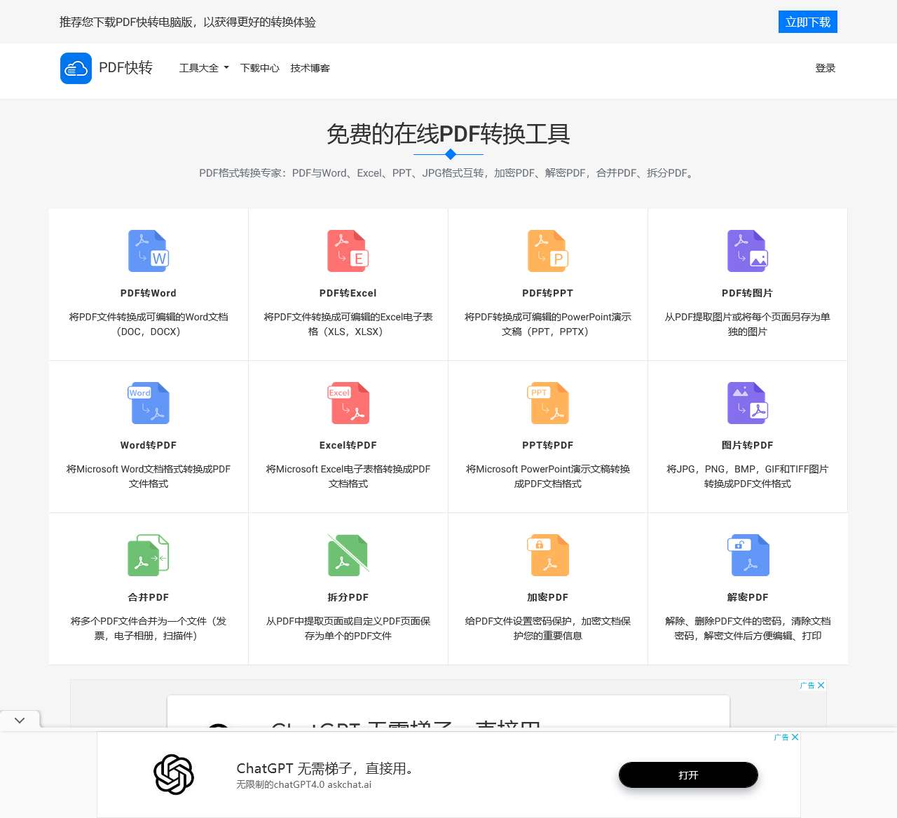 在PDF快转官网,您可以轻松地下载我们的转换工具。我们致力于为用户提供最好的服务,确保转换过程简单高效。另外,我们还为用户提供技术博客,协助您解决使用过程中的问题,让您能够更加顺利地完成转换工作。