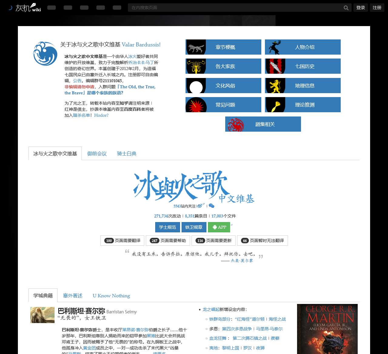 冰与火之歌中文维基是一个由华人冰与火之歌粉丝共同维护的开放维基,致力于全面完整的解析乔治·R·R·马丁所创造的奇幻世界。本维基2012年2月创建于Wikia,为造福七国民众,现已由塞外迁入长城之内。