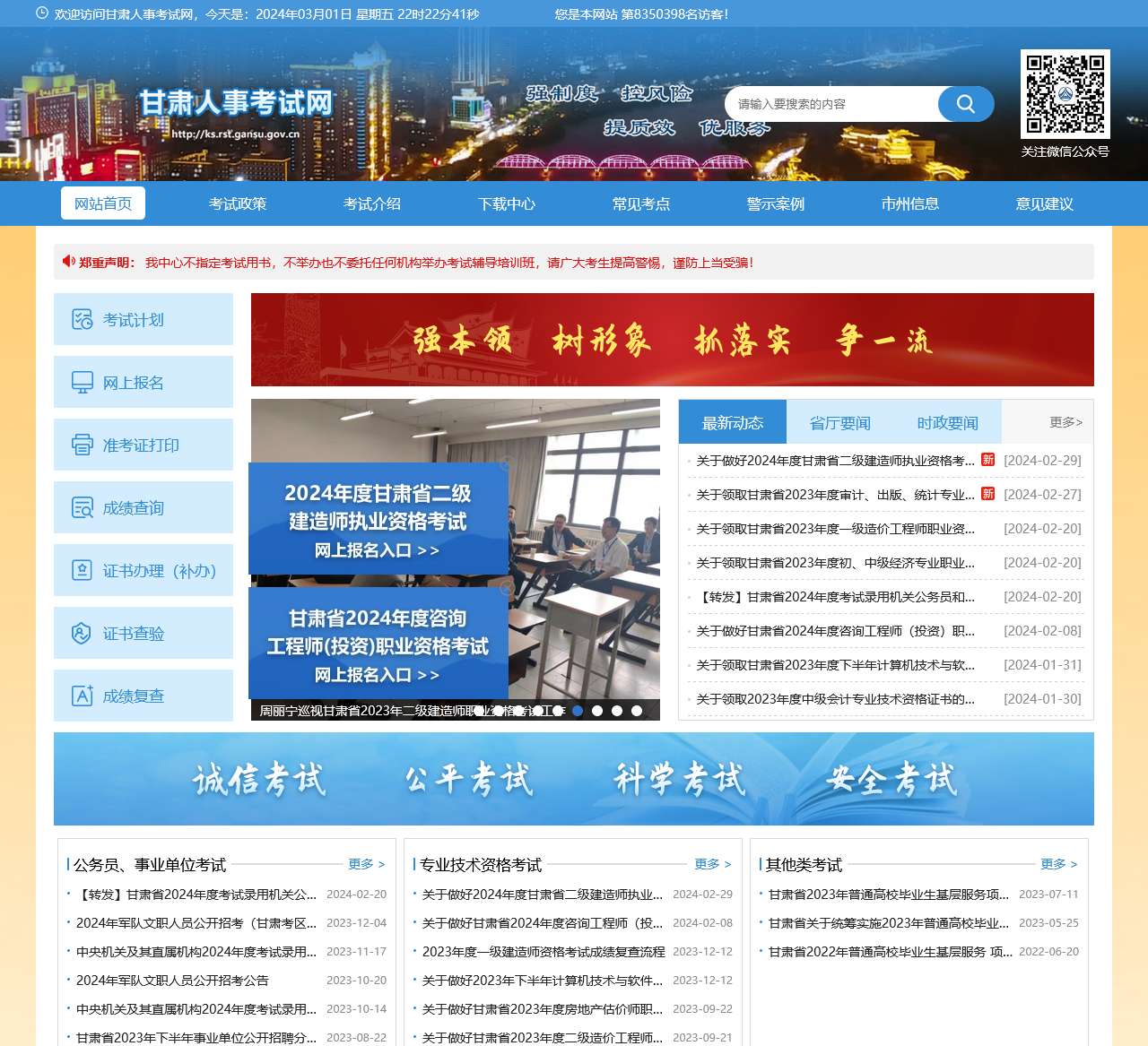 网站首页突出了最新的通知信息,包括关于2024年度甘肃省二级建造师执业资格考试报名工作的通知、领取各类职业资格证书的通知等。这有助于用户及时获取重大信息,确保参与各类考试的顺利进行。