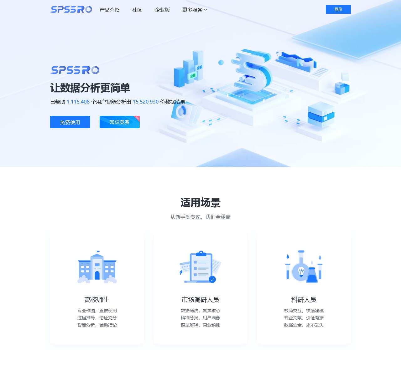 欢迎来到SPSSPRO,您专业、高效的在线数据分析平台!我们致力于为用户提供免费且专业的数据分析服务,助您轻松解决数据相关问题。以下是我们平台提供的主要功能和服务: