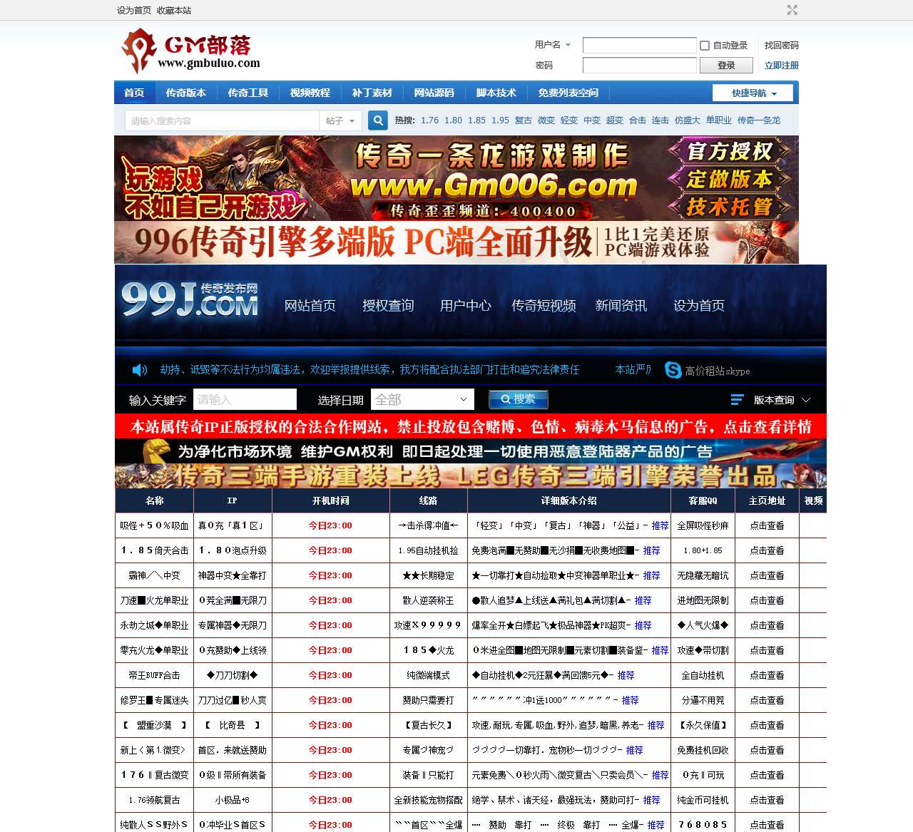 markdown# 传奇服务端、GM基地、传奇版本论坛、GM部落 ## 网站简介 欢迎访问我们的传奇服务端、GM基地、传奇版本论坛、GM部落联合平台!我们致力于为广大传奇玩家提供全方位的资源、工具、技术支持和交流平台。无论您是热血传奇的老玩家还是新手,这里都是您不可错过的家园。 ## 网站导航 - [设为首页](#) | [收藏本站](#) | [开启辅助访问](#) | [切换到宽版](#) - [登录](#) | [立即注册](#) | [找回密码](#) ## 网站功能 ### 传奇版本 在这里,您可以轻松查找各种传奇版本,包括但不限于: - 1.76 - 1.80 - 1.85 - 1.95 - 复古 - 微变 - 轻变 - 中变 - 超变 - 合击 - 连击 - 仿盛大 - 单职业 ### GM部落论坛 GM部落论坛是传奇玩家交流的热门场所,最新帖子包括: - 沉默不朽专属剧情单职业版[GOM引 ... - 三千繁梦微变单职业版[GXX引擎] - 嗨神超变单职业版[GOM引擎] - ...(更多帖子请访问GM部落论坛) ### GM部落资源区 - 视频教程 - 传奇单机架设-电脑路由器外网架 ... - 传奇工具 - 《热血传奇》十七周年完整传奇客 ... - 脚本技术 - 扎金花传奇脚本 - 网站源码 - 价值3000元地9.0版花旗支付平台 ... - 补丁素材 - 《热血传奇》传奇十周年珍藏版客 ... ### GM部落公告区 - 官方公告 - GM部落建站理念 - 每日新闻 - 新区新版 人气爆棚!热血传奇1.7 ... ## 联系方式 - GM部落主体区 [传奇版本](#) 最后发表: 21 秒前 - [有问必答](#) 最后发表: 2024-2-15 20:47 - [单机游戏](#) 最后发表: 7 小时前 ## GM部落社区 - [润芒论坛](#) - [gm016论坛](#) - [jjj555论坛](#) - [GM起点](#) - 站长QQ: 297522007 - 鲁ICP备16023438号-15 - 鲁ICP备16008334号-18 ## GM基地 [返回顶部](#)
