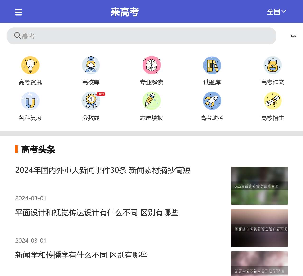 来高考为高中生提供高中学习方法,知识点总结,以及大学排名、专业排名、高校动态、志愿填报、位次表、大学录取分数线、高考真题下载、高考热门答疑等有用内容,是专注服务于高三学生的网站