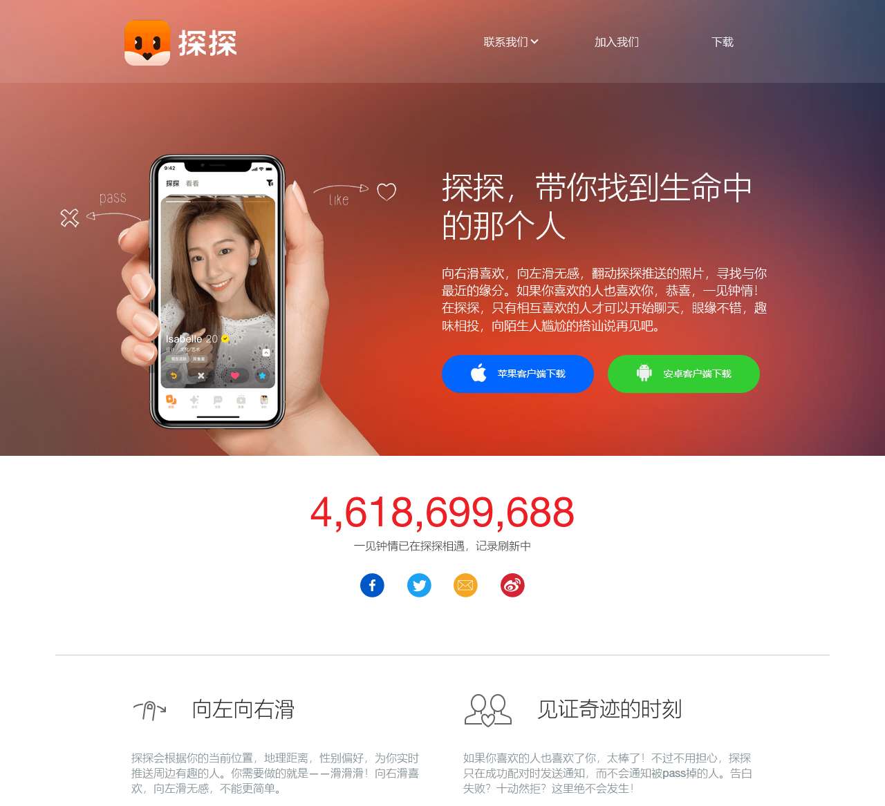 探探是一个基于大数据智能推荐、全新互动模式的社交App,根据用户的个人资料、位置、兴趣爱好等信息,计算并推送身边与你匹配的人,帮助用户结识互有好感的新朋友。