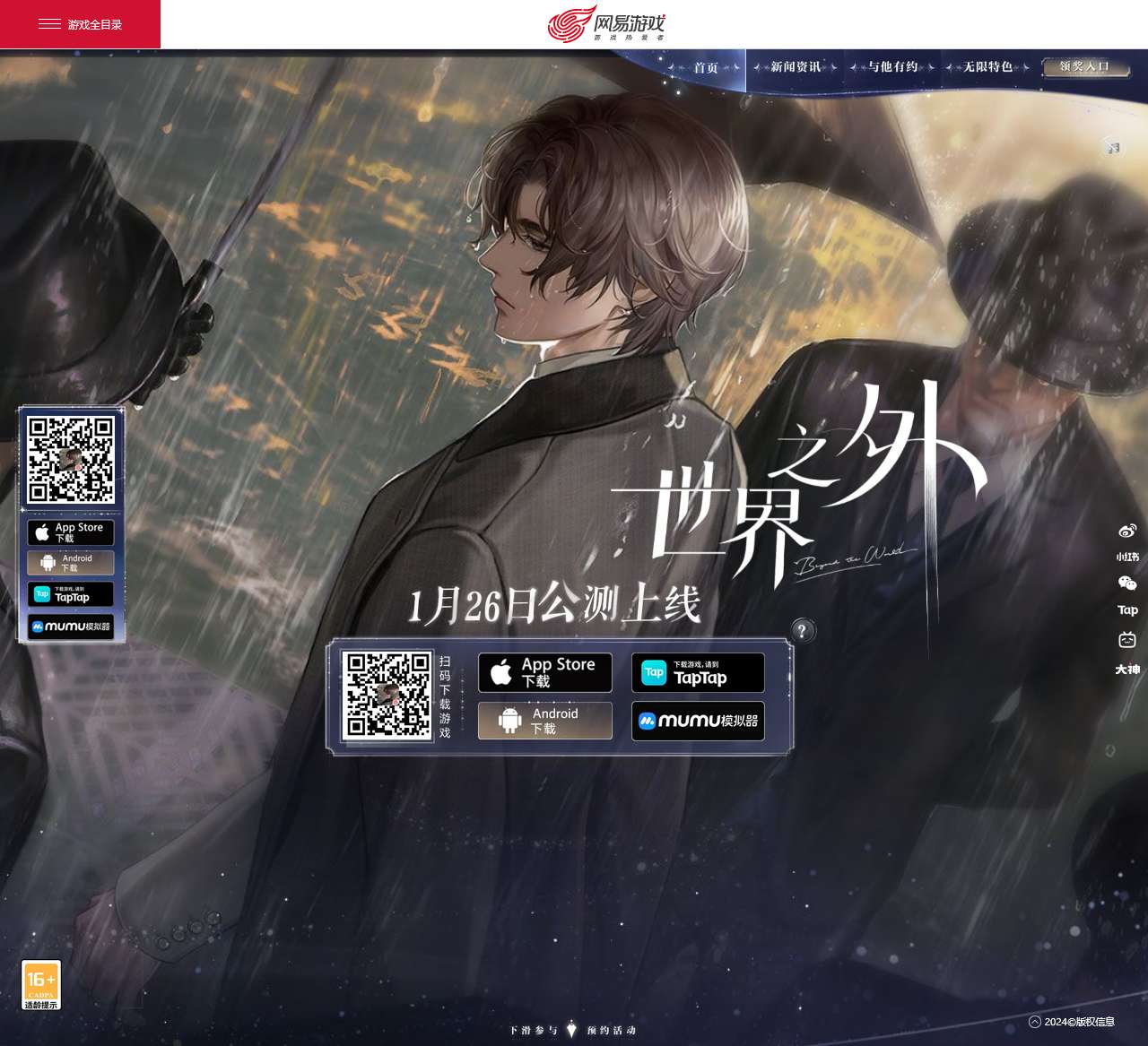 《世界之外》是一款备受期待的网易无限流言情手游,于2024年1月26日正式上线。该游戏以其丰富多样的游戏内容和引人入胜的情节而备受关注。下面是该游戏官方网站的首页内容的整理: