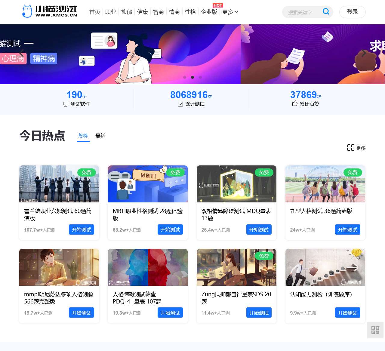 小猫测试,专业严肃的心理测评系统,致力于提供智商智力测试,情商测试,职业性格测试(mbti职业性格测试,霍兰德职业兴趣测试,九型人格测试),人格测试(大五人格,青年人格等),各类人格障碍测试PDQ-4+,心理健康测试(自卑,内向,社恐等),以及各类精神疾病测试(癔症,疑病,精分等),心理疾病测试(抑郁,焦虑等),企业人才测评等.小猫测试平台专注于心理测评领域,深耕技术服务,为个人和企业提供优质的测评体验.