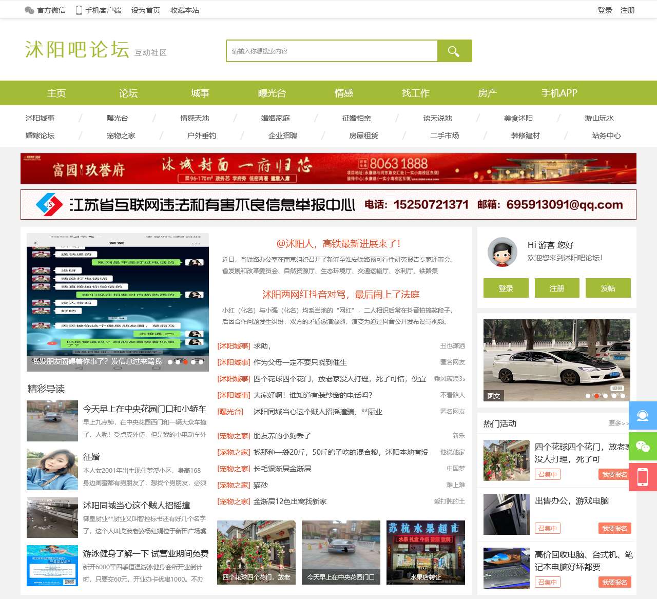 除了以上板块外,首页还包含了一些具体的帖子内容,列如沭阳两网红抖音对骂,最后闹上了法庭,征婚交友,情感天地,婚姻家庭等。这些帖子内容反映了用户关注的多个方面。