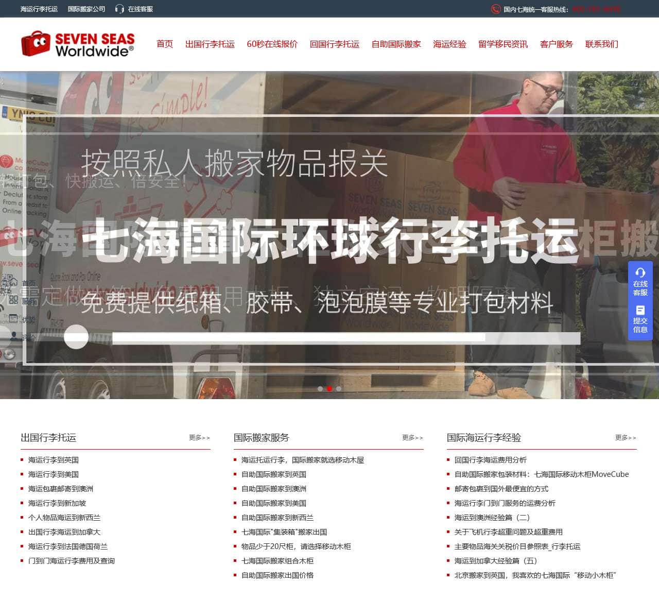 七海国际搬家公司提供出国行李托运及回国行李托运门到门一站式服务,从国内海运行李到英美澳加新等国家.七海国际专业的出国行李托运及国际搬家公司,价格透明,服务贴心,可将国际包裹邮寄至英国,美国,澳洲,加拿大,新西兰,新加坡等100多个国家和地区, 在国内服务近300个城市.在留学生,移民,访问学者,外国专家当中享有盛誉.