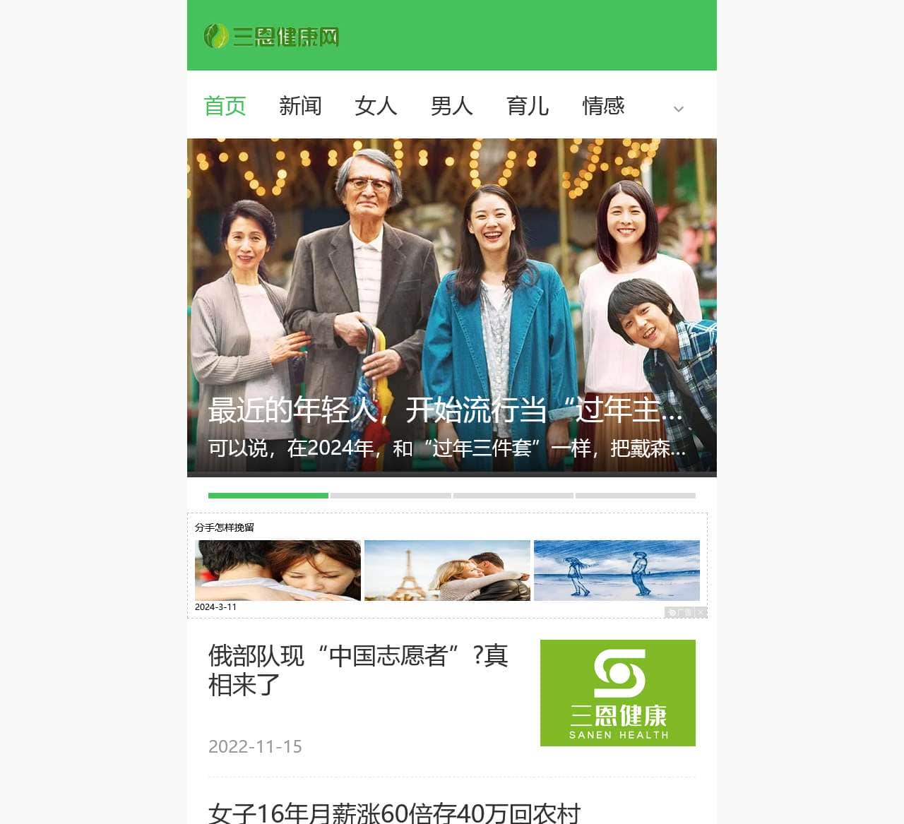 欢迎来到三恩健康网移动版!我们致力于为您提供最专业的健康养生资讯,让您随时随地获取权威的健康保健信息。通过我们的网站,您可以了解到各种健康领域的最新动态,包括新闻、女性健康、男性健康、育儿、情感、减肥、美容、整形、养生、中医、疾病、智能和图片等内容。