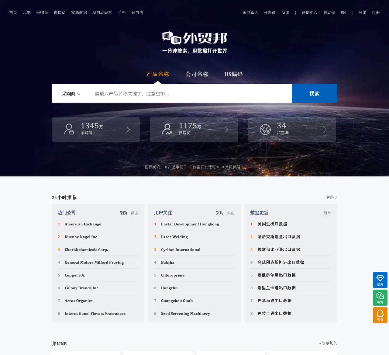外贸邦是一家优秀的贸易数据查询平台,拥有超过1345万采购商和1175万供应商的庞大用户群体,覆盖了34个贸易国家。作为一家数据全、更新快、体验好的平台,外贸邦为用户提供了丰富的功能和服务,包括AI自动获客、价格查询、站内信等。