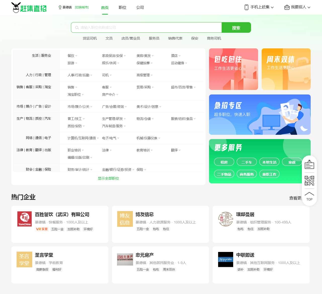 景德镇赶集直招,是景德镇更专业的招聘求职网站!海量职位、百强名企!互联网、银行、物流快递、电商、名企连锁等多种行业全覆盖,专业求职、找工作、高薪跳槽就上赶集直招 ganji.com!