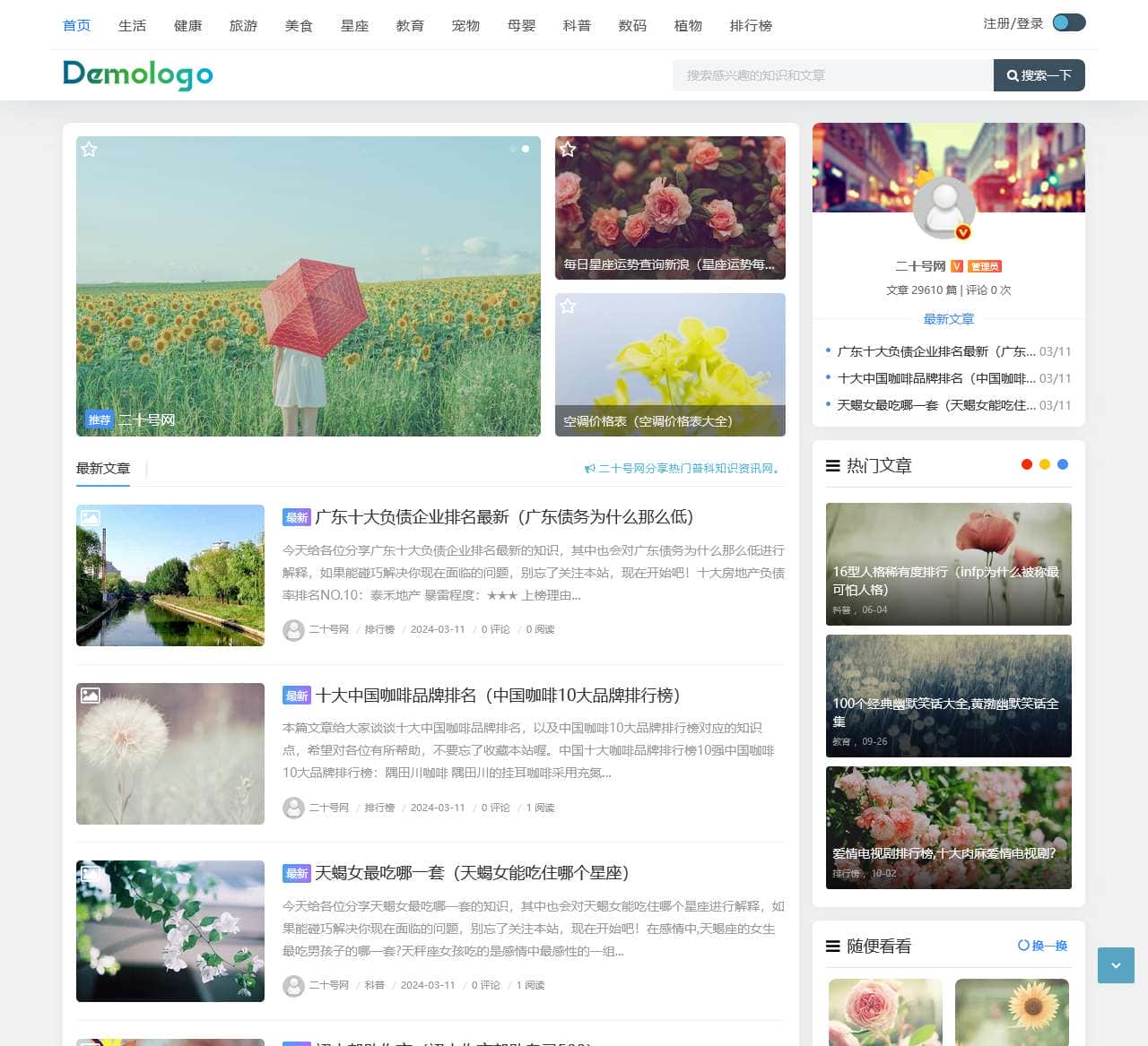 二十号网是一个知识普科平台,致力于分享各种热门资讯,涵盖生活、健康、旅游、美食、星座、教育、宠物、母婴、科普、数码、植物等多个领域。通过首页的内容可以看到,网站提供了丰富的内容,包括最新的文章、排行榜信息等。