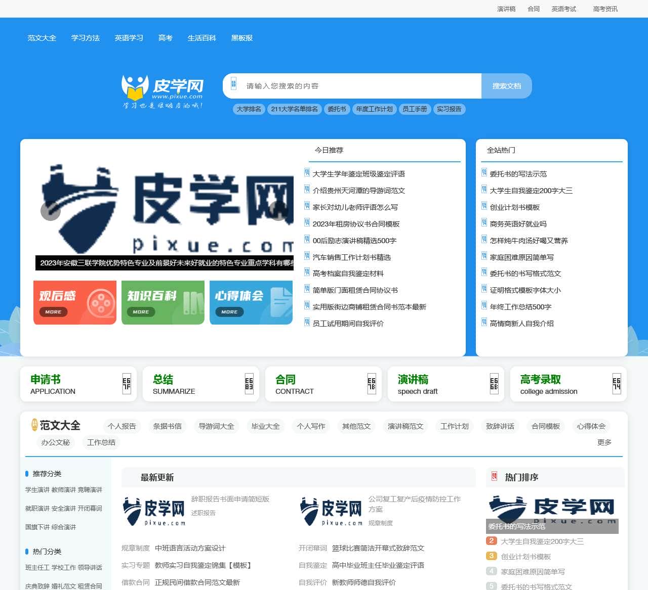 皮学网精心收集、整理、原创,古典图书集成,知识范文,英文学习,高考信息,实用文、总结、计划、祝福语、句子、职场文档等栏目为用户提供范文指导和优质素材等