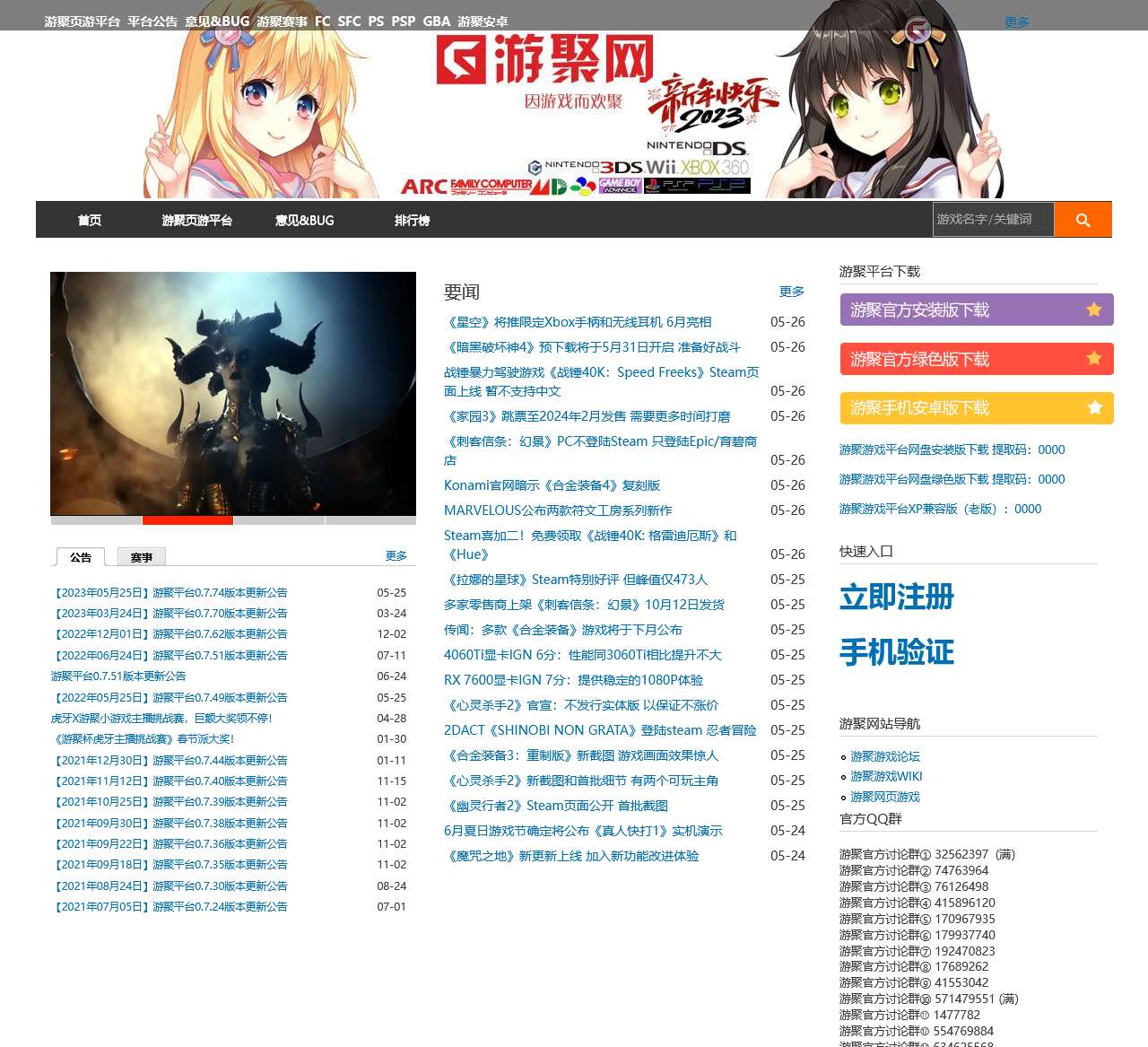 首页还展示了一些重大的公告信息,包括游聚平台的版本更新公告和赛事通知。这些公告旨在让玩家了解平台的最新动态,包括游戏功能改善、新功能上线和精彩赛事安排等内容。
