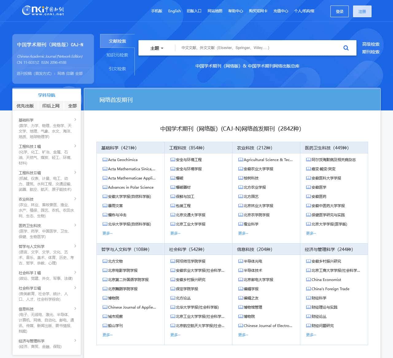 | 数学 | 非线性科学与系统科学 | 力学 | 物理学 | 生物学 | 天文学 | 自然地理学和测绘学 | 气象学 | 海洋学 | 地质学 | 地球物理学 | 化学 | 无机化工 | 有机化工 | 燃料化工 | 一般化学工业 | 石油天然气工业 | 材料科学 | 矿业工程 | 金属学及金属工艺 | 冶金工业 | 轻工业手工业 | 一般服务业 | 安全科学与灾害防治 | 环境科学与资源利用 | 机械工业 | 仪器仪表工业 | 航空航天科学与工程 | 武器工业与军事技术 | 铁路运输 | 公路与水路运输 | 汽车工业 | 船舶工业 | 水利水电工程 | 建筑科学与工程 | 动力工程 | 核科学技术 | 新能源 | 电力工业 | 农业基础科学 | 农业工程 | 农艺学 | 植物保护 | 农作物 | 园艺 | 林业 | 畜牧与动物医学 | 蚕蜂与野生动物保护 | 水产和渔业 | 医药卫生方针政策与法律法规研究 | 医学教育与医学边缘学科 | 预防医学与卫生学 | 中医学 | 中药学 | 中西医结合 | 基础医学 | 临床医学 | 感染性疾病及传染病 | 心血管系统疾病 | 呼吸系统疾病 | 消化系统疾病 | 内分泌腺及全身性疾病 | 外科学 | 泌尿科学 | 妇产科学 | 儿科学 | 神经病学 | 精神病学 | 肿瘤学 | 眼科与耳鼻咽喉科 | 口腔科学 | 皮肤病与性病 | 特种医学 | 急救医学 | 军事医学与卫生 | 药学 | 生物医学工程 | 文艺理论 | 世界文学 | 中国文学 | 中国语言文字 | 外国语言文字 | 音乐舞蹈 | 戏剧电影与电视艺术 | 美术书法雕塑与摄影 | 地理 | 文化 | 史学理论 | 世界历史 | 中国通史 | 中国民族与地方史志 | 中国古代史 | 中国近现代史 | 考古 | 人物传记 | 哲学 | 逻辑学 | 伦理学 | 心理学 | 美学 | 宗教 | 马克思主义 | 中国共产党 | 政治学 | 中国政治与国际政治 | 思想政治教育 | 行政学及国家行政管理 | 政党及群众组织 | 军事 | 公安 | 法理、法史 | 宪法 | 行政法及地方法制 | 民商法 | 刑法 | 经济法 | 诉讼法与司法制度 | 国际法 | 社会科学理论与方法 | 社会学及统计学 | 民族学 | 人口学与计划生育 | 人才学与劳动科学 | 教育理论与教育管理 | 学前教育 | 初等教育 | 中等教育 | 高等教育 | 职业教育 | 成人教育与特殊教育 | 体育 | 无线电电子学 | 电信技术 | 计算机硬件技术 | 计算机软件及计算机应用 | 互联网技术 | 自动化技术 | 新闻与传媒 | 出版 | 图书情报与数字图书馆 | 档案及博物馆 | 经济管理与可持续发展 | 经济理论及经济思想史 | 经济体制改革 | 经济统计 | 农业经济 | 工业经济 | 交通运输经济 | 企业经济 | 旅游 | 文化经济 | 信息经济与邮政经济 | 服务业经济 | 贸易经济 | 财政与税收 | 金融 | 证券 | 保险 | 投资 | 会计 | 审计 | 市场研究与信息 | 管理学 | 领导学与决策学 | 科学研究管理 | Acta Geochimica | Acta Mathematica Sinica, English Series | Acta Mathematicae Applicatae Sinica | Advances in Polar Science | 安徽大学学报(自然科学版) | 暴雨灾害 | 爆炸与冲击 | 北华大学学报(自然科学版) | 安全与环境工程 | 安全与环境学报 | 爆破 | 爆破器材 | 保鲜与加工 | 包装工程 | 北京交通大学学报 | 北京工业大学学报 | Agricultural Science & Technology | 安徽农业大学学报 | 桉树科技 | 北方农业学报 | 北方园艺 | 北京林业大学学报 | 北京农学院学报 | 蚕业科学 | 阿尔茨海默病及相关病杂志 | 癌变·畸变·突变 | 安徽医科大学学报 | 安徽医学 | 安徽医药 | 安徽中医药大学学报 | 保健医学研究与实践 | 北京大学学报(医学版) | 北方文物 | 北京电影学院学报 | 北京第二外国语学院学报 | 北京舞蹈学院学报 | 博物院 | Chinese Journal of Applied Linguistics | 城市观察 | 船山学刊 | 阿坝师范学院学报 | 安徽农业大学学报(社会科学版) | 安徽乡村振兴研究 | 保定学院学报 | 北方论丛 | 北华大学学报(社会科学版) | 北京工业大学学报(社会科学版) | 北京航空航天大学学报(社会科学版) | 半导体光电 | 半导体技术 | 北京邮电大学学报 | 编辑学报 | 编辑之友 | 博物馆管理 | 博物院 | Chinese Journal of Electronics |