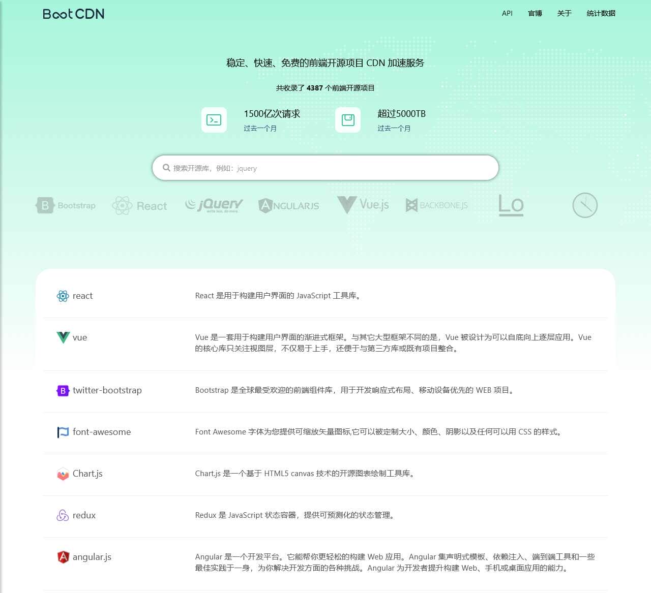 Bootstrap 中文网开源项目免费 CDN 加速服务 – 我们致力于为 Bootstrap、jQuery、Angular、Vue.js 一样优秀的开源项目提供稳定、快速、免费的 CDN 加速服务。BootCDN 是运营时间最长、用户量最大、最早同时支持 HTTPS(SSL)和 HTTP/2.0 协议的中立免费 CDN 。
