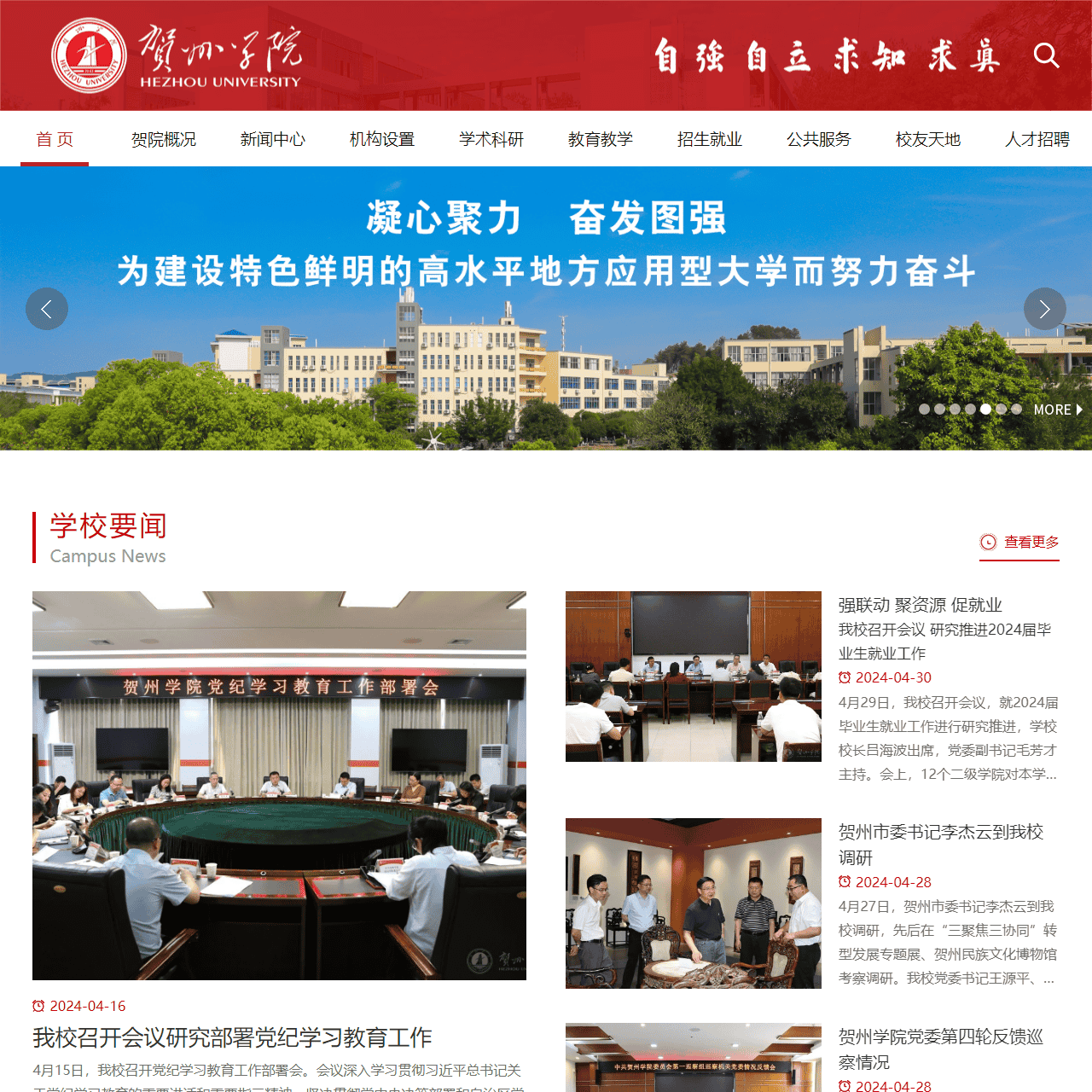 | 2024-04-16 | 我校召开会议研究部署党纪学习教育工作 | 4月15日,我校召开党纪学习教育工作部署会。会议深入学习贯彻习近平总书记关于党纪学习教育的重大讲话和重大指示精神,坚决贯彻党中央决策部署和自治区党委部署要求,全面落实中央和自治区党委党的建设工作领导小组会议精神,对全校开展党纪学习教育进行启动部署。学校党委书记王源平出席会议并作动员讲话,学校纪委书记袁胜军主持会议。会前,学校召开党委常委会,传达学习了中央党的建设工作领导小组会议精神,审议了《中共贺州学院委员会关于开展党纪学习教育的实施方案》。 |
