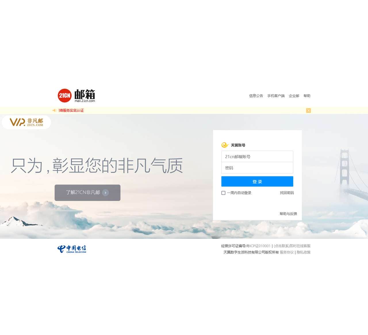 21CN免费邮箱–中文电子邮箱著名品牌之一。大容量,免费开通手机号码邮,10G超大空间。支持PC、手机、平板的客户端收发电子邮件。清新界面-高效杀毒-积分有奖活动。