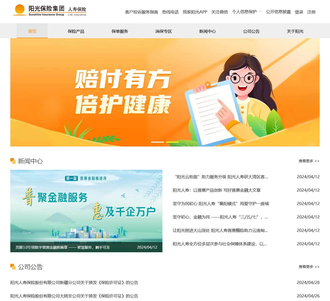 | 保险产品 | 保单服务 | 消保专区 | 新闻中心 | 公司公告 | 关于阳光 | 查看更多 >> |