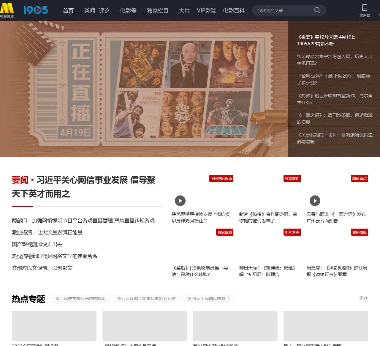 | 新闻 | 《夜宴》等12片来袭 4月19日1905APP精彩不断,张艺谋乌尔善宁浩纷纷入局,历史大片生机再现?,哈利·波特电影上映20年,到底赚了多少钱?,《封神》迟迟未映却官宣新作,乌尔善凭什么?,《一面之词》:厦门沙茶面,邂逅海滩的浪漫,《关于我妈的一切》:徐帆张婧仪传递爱与温暖,习近平关心网信事业发展倡导聚天下英才而用之,两部门加强网络视听节目平台游戏直播管理严禁直播违规游戏,激浊扬清,让大流量澎湃正能量,国产影视剧加快走出去,热忱描绘新时代是网络文学的使命所系,文创应以文促创、以创彰文,中国电影报道演艺界明星持续支援上海抗疫以身作则回馈社会,新片《热搜》合作周冬雨,曾惊艳的他们怎样了,云吞与面条《一面之词》发布广州云吞面预告,《幕后》给动物演员当“导演”是种什么体验?,帅出天际!《新神榜:杨戬》曝“初见君”版预告,周票房《神奇动物3》蝉联周冠《边缘行者》亚军,第六届成龙国际动作电影周,第八届丝绸之路国际电影节专题,第24届上海国际电影节,肖顺尧:只有不断钻研才能做到专业,任达华拍《边缘行者》拒用替身,任贤齐谈当下音乐的创作缺失:生产速度快,郭晓婷夸迪丽热巴性格好,杨洋:一直有军人情结,颖儿分享与景甜的闺蜜情,海清:曾一度反感被称“国民媳妇”,《幕后》给动物演员当“导演”是种什么体验?,新片《热搜》合作周冬雨,曾惊艳的他们怎样了,邓小平小道开启预售传递一代伟人的精神力量,三界第一神颜!《新神榜:杨戬》发布先导预告,路阳《风起陇西》发布海报,陈坤白宇穿戴汉代服饰,周票房《神奇动物3》蝉联周冠《边缘行者》亚军,《猪猪侠大电影·海洋日记》撤档原定4月30日上映,笑星集结!电影《东北告别天团》预告、海报首发,《亡命救护车》曝幕后特辑众主演盛赞“爆炸贝”,《新蝙蝠侠》全球票房超7.5亿美元将上线流媒体,本周精彩欢乐喜剧加惊险刺激实力演技撑住全场,再度出演帮派大佬!当任达华遇上警匪片,绝了,“热搜焦虑”怎么破?网信办发文叫停恶意营销,13部票房破千万!这里的电影,潜力到底有多大?,邱天:每一个选择我都不后悔,郑云龙:演员要有信念感责任感,陈永胜:新 |