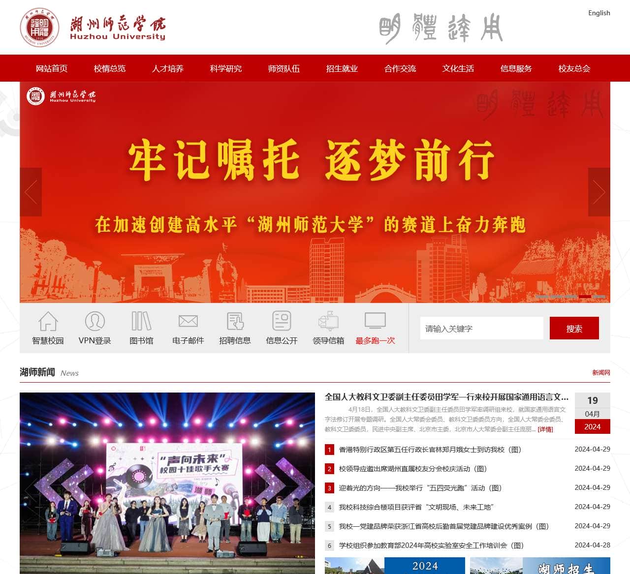 | 新闻网 | 全国人大教科文卫委副主任委员田学军一行来校开展国家通用语言文字法修订工作专题调研(图) [详情] 香港特别行政区第五任行政长官林郑月娥女士到访我校(图) 校领导应邀出席湖州直属校友分会校庆活动(图) 迎着光的方向——我校举行“五四荧光跑”活动(图) 我校科技综合楼项目获评省“文明现场、未来工地” 我校一党建品牌荣获浙江省高校后勤首届党建品牌建设优秀案例(图) 学校组织参与教育部2024年高校实验室安全工作培训会(图) 更多+ 中国科学院院士王玉鹏一行来校交流(图) 我校教师在国际知名期刊《Journal of Colloid and Interface Science》上发表研究论文(图) 我校教师在国际著名学术期刊《Carbon Energy》上发表研究论文(图) 可持续发展研究院召开“两山”理念与“千万工程”学术研讨会(图) 更多+ 2024年体育学院“明体论道”(五)学术讲座 关于举办2024 年浙江省高校美术与设计学院院长联盟 “艺术赋能乡村振兴”专题学术会议(二)的通知 教师教育学院2024年“太湖教育论坛”(二) Tea Time学术活动系列邀请报告(228-231) 关于开展《科学跑步 健康生活》专题讲座的通知 后勤服务中心2024 年劳动节期间餐厅服务安排 关于实行夏季作息时间的通知 关于对部分道路采取临时交通管控措施的通知 湖州师范学院2024年第四批拟聘用人员公示 胡瑗大讲堂:践行四力守正创新——从中国新闻奖获奖作品谈起 关于参与中法建交60周年暨2024第四届中法名校足球冠军杯·湖州行活动的通知 更多+ 人民日报用户端:“践行两山理念 建设秀丽中国 助力共同富裕” 第55个世界地球日主题活动在湖州南浔举办 《人民日报》海外版:“洋学生”成湖州美食“粉丝” 青塔:拥抱“两山” “明体达用”,这所大学不一般! 央广在线:迎着光的方向,无惧风雨,湖师青年在奔跑中诠释青春 更多+ 奔跑吧,湖师! 安定中学,他真的来了! 传承百年文化 庚续一院辉煌 燃!湖州师范学院举行2023级学生军训动员大会 更多+ |