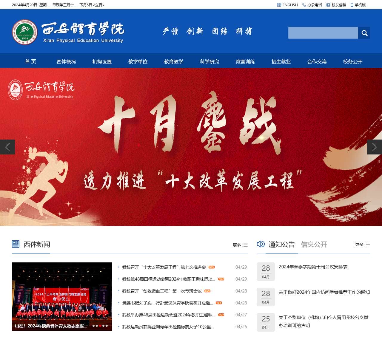 | 课程与教学 | 关于2024年劳动节期间调整本科课程的通知、关于公布第三批校级一流课程结项验收结果的通知、关于本科专业人才培养方案(2024)后续工作安排的通知、关于征集校庆70周年教学成果展材料的通知、关于西安体育学院第48届田径运动会期间调整本科课程的通知、关于2024年我校承担体育单招考试期间鄠邑校区部分场… |