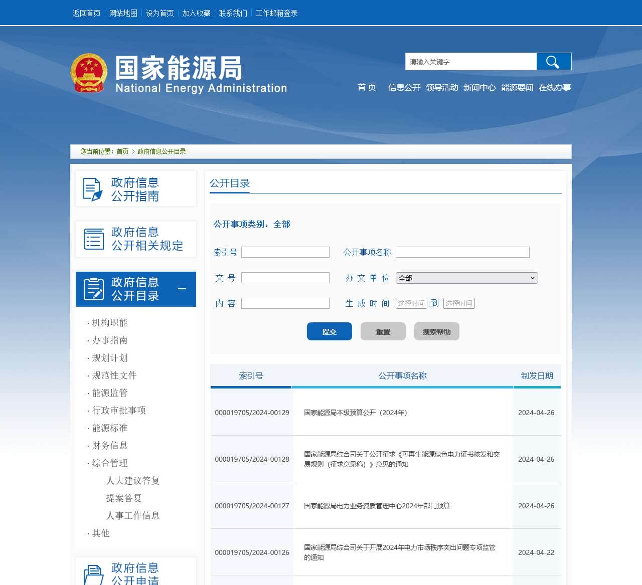 | 能源监管 | 行政审批事项 能源标准 财务信息 |