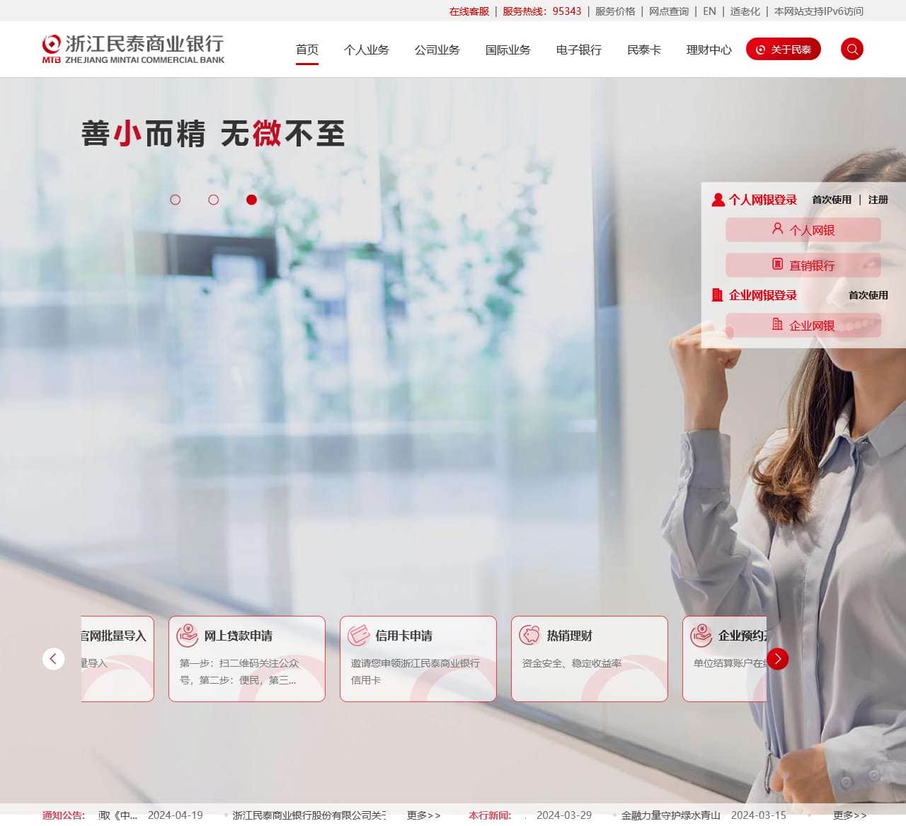 | 活动公告 | 热销理财、企业预约开户、单位结算账户在线申请、民泰惠生活、积分商城、企业官网对账、代收代付官网批量导入、网上贷款申请、信用卡申请 |