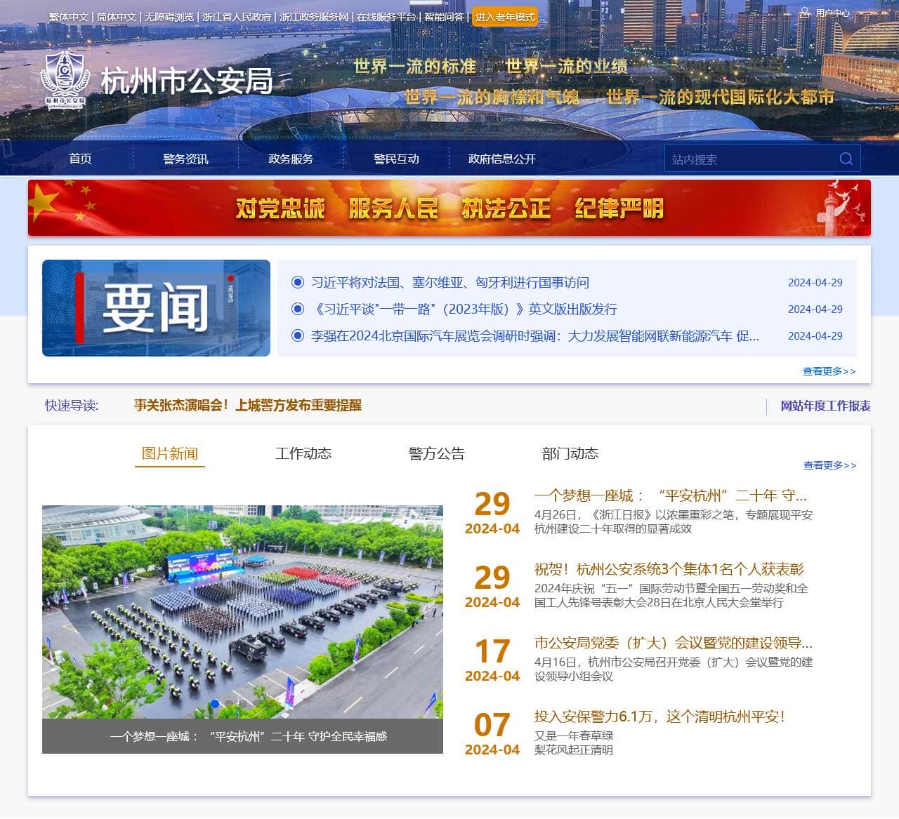 | 2024-04- | 杭州公安系统3个集体1名个人获表彰,庆祝“五一”国际劳动节暨全国五一劳动奖和全国工人先锋号表彰大会举行 |