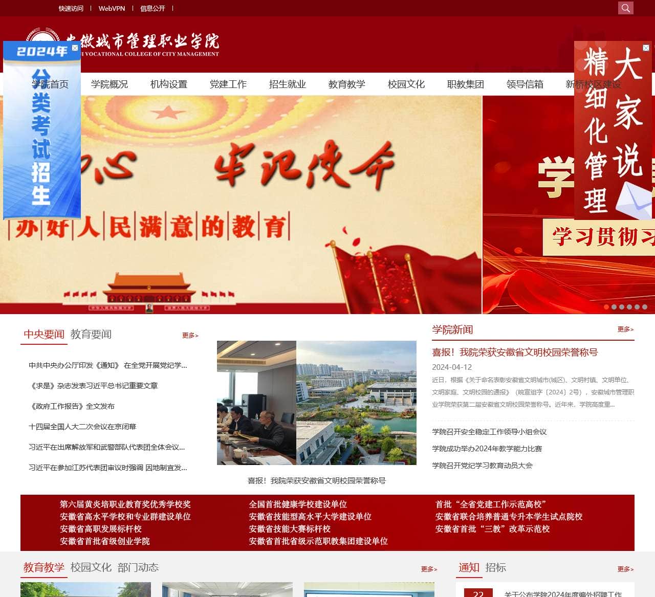 | 近日,根据《关于命名表彰安徽省文明城市(城区)、文明村镇、文明单位、文明家庭、文明校园的通报》(皖宣组字〔2024〕2号),安徽城市管理职业学院荣获第二届安徽省文明校园荣誉称号。近年来,学院高度重… | |