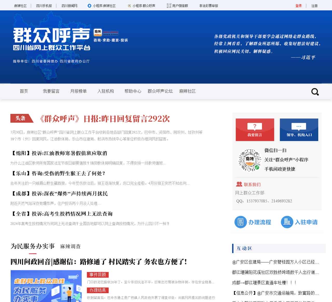 麻辣社区群众呼声是四川省网络问政/网络理政平台。咨询、求助、投诉、意见、建议……来麻辣社区“群众呼声”留言,全省各地各部门在线回应。