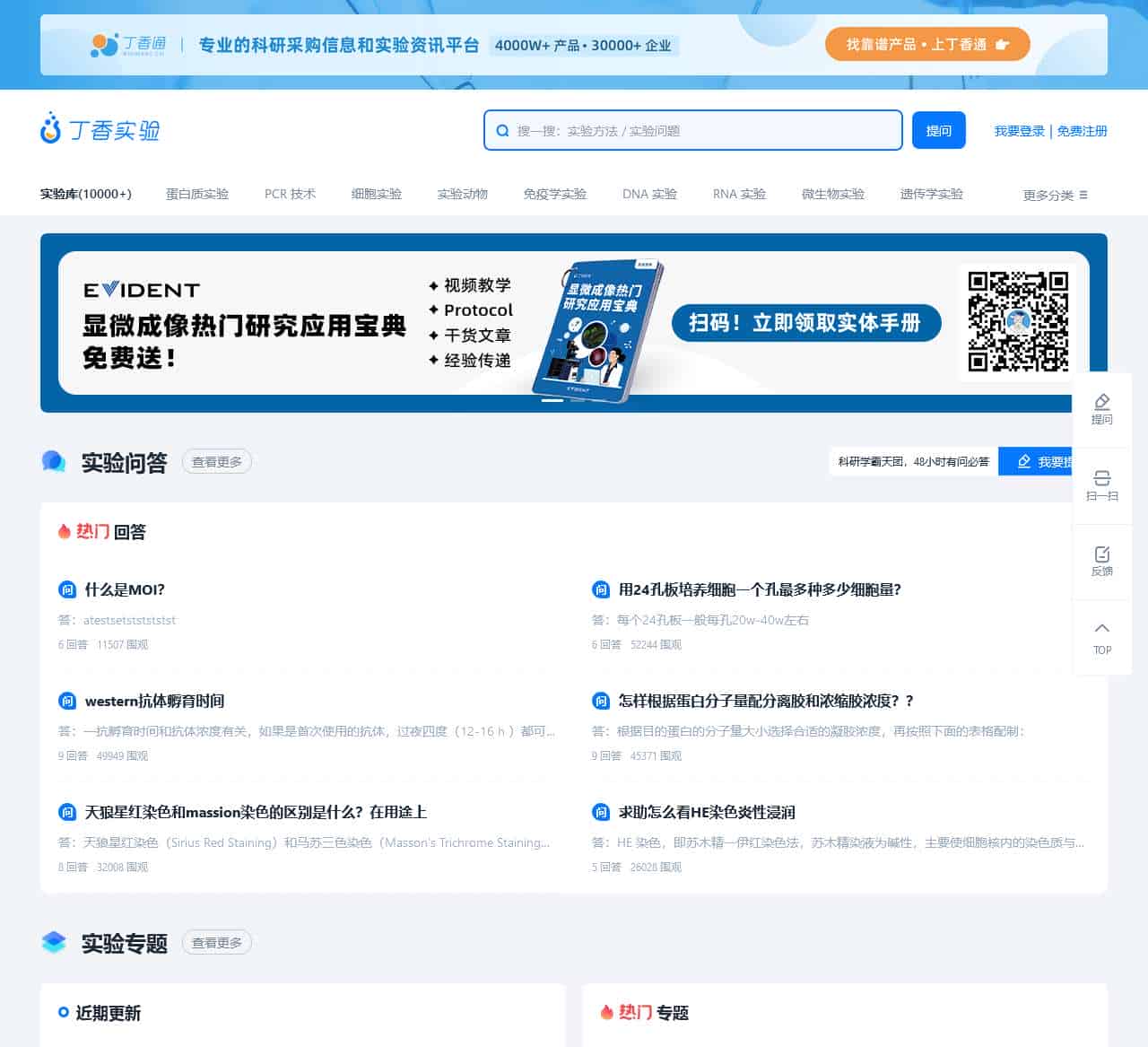 丁香实验是丁香园旗下专业的科研实验资料平台,为您提供蛋白质、DNA、RNA、细胞、免疫学、生物化学等方向的大量实验案例及相关资讯与专题。更有问答频道的无数大佬为您解决实验过程中遇见的各种问题。科研实验查找资料方法就来丁香实验。
