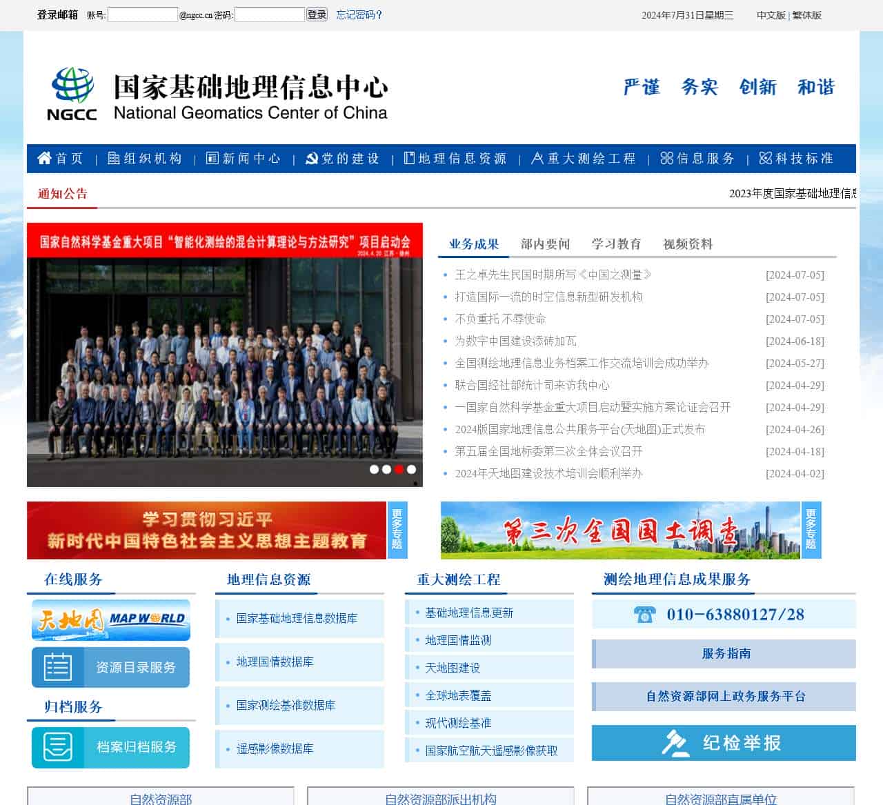 lua| 栏目 | 内容 | |-----------------------|------------------------------------| | 忘记密码? | 中文版 | | 繁体版 | 首页 | | 组织机构 | 中心简介 | | 领导之窗 | 内设机构 | | 国信司南公司 | 新闻中心 | | 业务成果 | 部内要闻 | | 学习教育 | 视频资料 | | 通知公告 | 党的建设 | | 党规党纪 | 专题教育 | | 廉政警示教育 | 地理信息资源 | | 国家基础地理信息数据库 | 地理国情数据库 | | 国家测绘基准数据库 | 遥感影像数据库 | | 重大测绘工程 | 基础地理信息更新 | | 地理国情监测 | 天地图建设 | | 全球地表覆盖 | 现代测绘基准 | | 国家航空航天遥感影像获取 | 信息服务 | | 服务指南 | 自然资源部网上政务服务平台 | | 科技标准 | 自然资源标准化信息服务平台 | | 全国地理信息标准化技术委员会 | 科研成果 | | 科技奖项统计 | 发表专著及论文 | | 科研力量 | 专家队伍 | | 博士后工作站 | 时空信息学报 | | 通知公告 | 2023年度国家基础地理信息中心决算 | | 国家基础地理信息中心2024年预算 | 国家基础地理信息中心关于启用国家地理信息公共服务平台(天地图)2024版的公告 | | 业务成果 | 部内要闻 | | 学习教育 | 视频资料 |