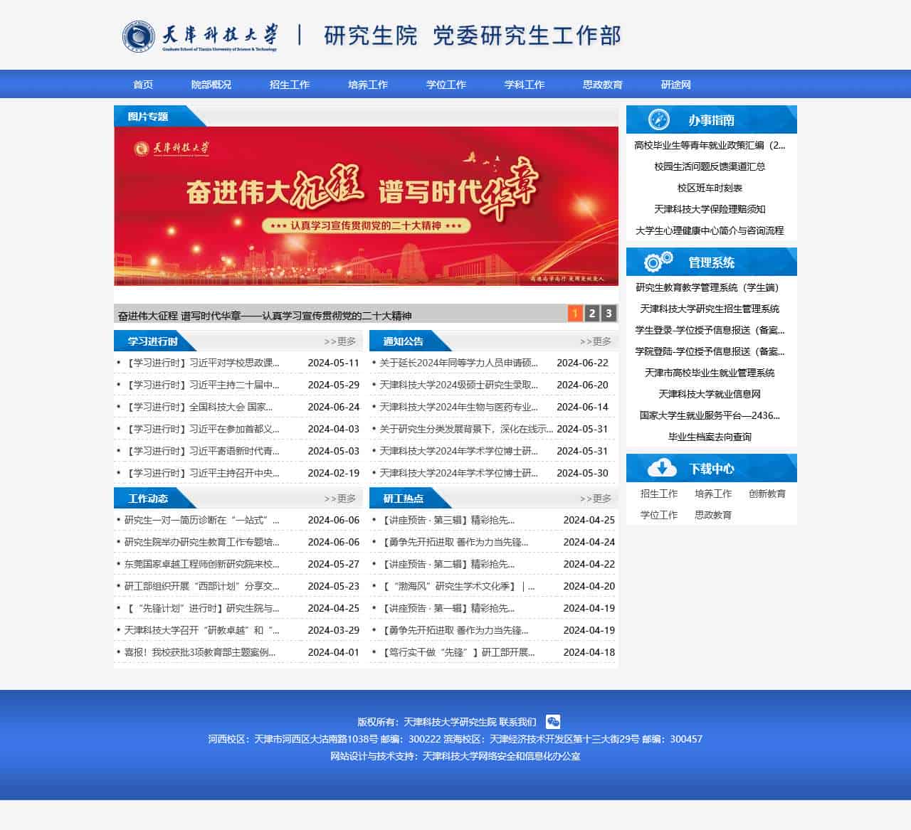 markdown| 首页 | 院部概况 | 招生工作 | 培养工作 | 学位工作 | 学科工作 | 思政教育 | 研途网 | |------|-----------|-----------|-----------|-----------|-----------|-----------|-------| | 1 | 2 | 3 | >>更多 | | 学习进行时 | |---------------| | 习近平对学校思政课... | | 习近平主持二十届中... | | 全国科技大会 国家... | | 习近平在参与首都义... | | 习近平寄语新时代青... | | 习近平主持召开中央... | | >>更多 | | 研究生动态 | |---------------| | 研究生一对一简历诊断在“一站式”... | | 研究生院举办研究生教育工作专题培... | | 东莞国家卓越工程师创新研究院来校... | | 研工部组织开展“西部计划”分享交... | | 【“先锋计划”进行时】研究生院与... | | 天津科技大学召开“研教卓越”和“... | | 喜报!我校获批3项教育部主题案例... | | >>更多 | | 通知公告 | |---------------| | 关于延长2024年同等学力人员申请硕... | | 天津科技大学2024级硕士研究生录取... | | 天津科技大学2024年生物与医药专业... | | 关于研究生分类发展背景下,深化在线示... | | 天津科技大学2024年学术学位博士研... | | 天津科技大学2024年学术学位博士研... | | >>更多 | | 讲座预告 | |---------------| | 【讲座预告 · 第三辑】精彩抢先... | | 【勇争先开拓进取 善作为力当先锋... | | 【讲座预告 · 第二辑】精彩抢先... | | 【“渤海风”研究生学术文化季】|... | | 【讲座预告 · 第一辑】精彩抢先... | | 【勇争先开拓进取 善作为力当先锋... | | 【笃行实干做“先锋”】研工部开展... | | 校园生活 | |---------------| | 高校毕业生等青年就业政策汇编(2... | | 校园生活问题反馈渠道汇总 | | 校区班车时刻表 | | 天津科技大学保险理赔须知 | | 大学生心理健康中心简介与咨询流程 | | 研究生教育教学管理系统(学生端) | | 天津科技大学研究生招生管理系统 | | 学生登录-学位授予信息报送(备案... | | 学院登陆-学位授予信息报送(备案... | | 天津市高校毕业生就业管理系统 | | 天津科技大学就业信息网 | | 国家大学生就业服务平台—2436... | | 毕业生档案去向查询 |