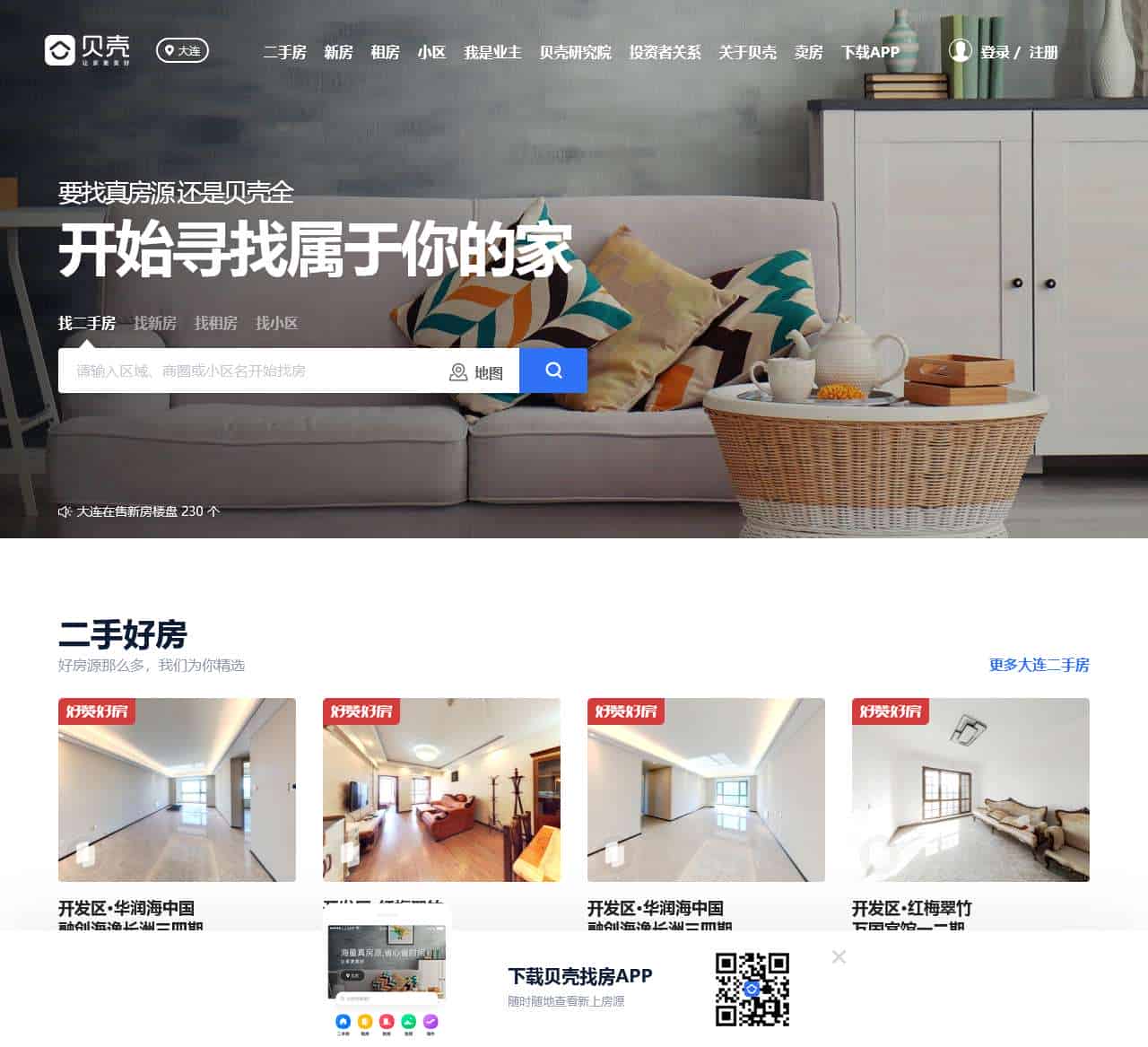 大连贝壳找房提供真实房源的房产信息平台,为大连买房、大连二手房、大连新房购买以及大连租房需求的用户提供便捷服务.同时有智能找房、VR看房等先进科技找房功能等你来体验,想在大连买房、购买大连二手房、新房、租房,想了解到一手房产资讯、房价行情,就来大连贝壳找房吧!