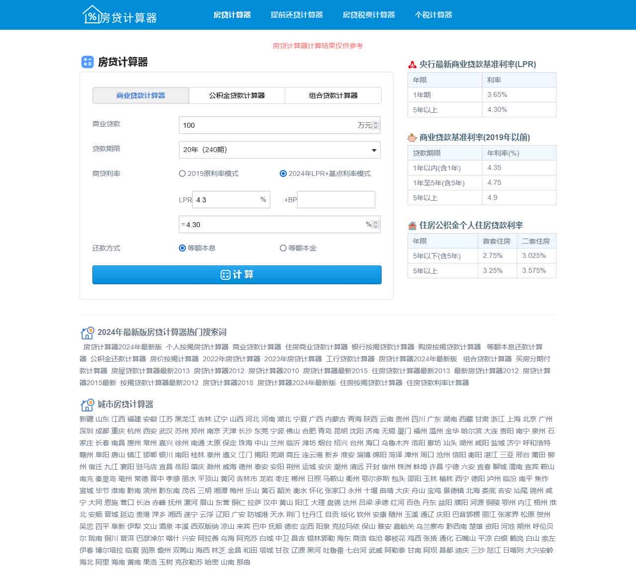 房贷计算器2024年最新版包含有:商业贷款计算器、公积金贷款计算器、组合贷款计算器,当前房贷计算器包含有央行最新商业贷款基准利率(LPR),可快速计算等额本息、等额本金等各种贷款利率。