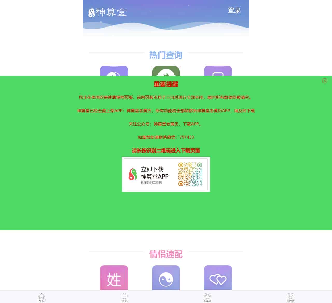 | 神算堂已经全面上架APP:神算堂老黄历,所有功能将全部转移到神算堂老黄历APP,请及时下载 | |