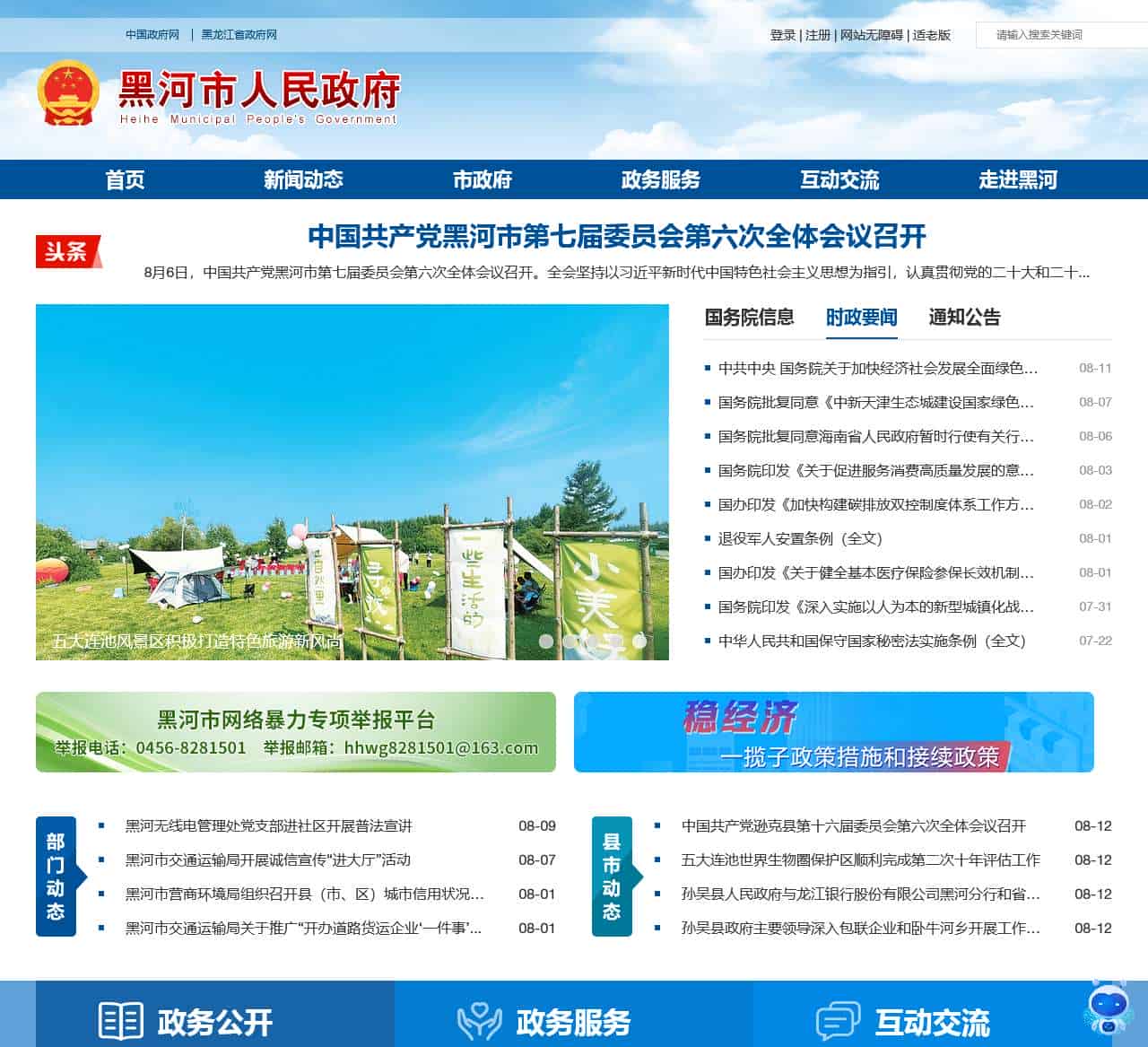 plaintext+--------------------------------------------+--------------------------------------------------------------------+ | 登录 | 注册 退出 网站无障碍 适老版 中国政府网 黑龙江省政府网 | +--------------------------------------------+--------------------------------------------------------------------+ | 首页 | | +--------------------------------------------+--------------------------------------------------------------------+ | 新闻动态 | | | 市政府 | | | 政务服务 | | | 互动交流 | | | 走进黑河 | | +--------------------------------------------+--------------------------------------------------------------------+ | 赵荣国:聚焦重点回应关切 纵深推进整改整治 让改革发展成果更多更公平惠... | 7月25日上午,我市召开全市政府系统群众身边不正之风和腐败问题聚焦整治工作推进会议,对全市政府系统聚焦整治工作进行再安排、再部署。市委副... | +--------------------------------------------+--------------------------------------------------------------------+ | 中国共产党黑河市第七届委员会第六次全体会议召开 | 8月6日,中国共产党黑河市第七届委员会第六次全体会议召开。全会坚持以习近平新时代中国特色社会主义思想为指引,认真贯彻党的二十大和二十... | +--------------------------------------------+--------------------------------------------------------------------+ | 中共黑河市委召开七届91次常委会会议 | 8月5日,市委书记李锡文主持召开市委常委会会议,传达学习近期习近平总书记重大讲话重大指示精神、贺信精神和中共中央政治局会议、中共中央... | +--------------------------------------------+--------------------------------------------------------------------+ | 中共黑河市委召开七届90次常委会会议 | 8月2日下午,市委书记李锡文主持召开市委常委会会议,传达学习近期习近平总书记重大讲话重大指示精神和重大文章精神,近期省委系列会议精神... | +--------------------------------------------+--------------------------------------------------------------------+ | 赵荣国:聚焦重点回应关切 纵深推进整改整治 让改革发展成果更多更公平惠... | 7月25日上午,我市召开全市政府系统群众身边不正之风和腐败问题聚焦整治工作推进会议,对全市政府系统聚焦整治工作进行再安排、再部署。市委副... | +--------------------------------------------+--------------------------------------------------------------------+ | 中国共产党黑河市第七届委员会第六次全体会议召开 | 8月6日,中国共产党黑河市第七届委员会第六次全体会议召开。全会坚持以习近平新时代中国特色社会主义思想为指引,认真贯彻党的二十大和二十... | +--------------------------------------------+--------------------------------------------------------------------+ | 国务院信息 | 时政要闻 通知公告 中共中央 国务院关于加快经济社会发展全面绿色转型的意见 国务院批复同意《中新天津生态城建设国家绿色发展示范区实施方案(2024—20… 国务院批复同意海南省人民政府暂时行使有关行政审批权限 国务院印发《关于促进服务消费高质量发展的意见》 国办印发《加快构建碳排放双控制度体系工作方案》 退役军人安置条例(全文) 国办印发《关于健全基本医疗保险参保长效机制的指导意见》 国务院印发《深入实施以人为本的新型城镇化战略五年行动计划》 中华人民共和国保守国家秘密法实施条例(全文) 职工医保个人账户可以用于本人近亲属、连续... 学习贯彻党的二十届三中全会精神省委宣讲团... 七届黑河市委召开第五轮巡察聚焦反馈会议 市七届人大常委会召开第二十二次会议 黑河自贸片区聘任“营商环境体验官” 黑河市启动铸牢中华民族共同体意识宣传季活动 五大连池世界生物圈保护区迎来第二次十年评估 黑河市厚植生态优势探索践行“两山论”新路... 市七届人大常委会召开第四十三次主任会议 关于开展《黑河城区公共交通发展规划(征求... 关于邀请参与《黑河市12345政务服务便民热线... 关于《黑河市12345政务服务便民热线条例(征... 关于《黑河市城市供热用热办法(修正)(征... 关于《黑河市饮用水水源保护条例(修正)(征... 黑河市2024年市级乡村建设任务清单 关于开展涉及不平等对待企业法律法规政策清... 黑河市人民政府关于草原禁牧范围的公示 黑河市人民政府办公室关于印发《黑河市人民... | +--------------------------------------------+--------------------------------------------------------------------+ | 中国共产党逊克县第十六届委员会第六次全体会议召开 | 五大连池世界生物圈保护区顺利完成第二次十年评估工作 孙吴县人民政府与龙江银行股份有限公司黑河分行和省农业... 孙吴县政府主要领导深入包联企业和卧牛河乡开展工作调研 黑河无线电管理处党支部进社区开展普法宣讲 黑河市交通运输局开展诚信宣传“进大厅”活动 黑河市营商环境局组织召开县(市、区)城市信用状况监测... 黑河市交通运输局关于推广“开办道路货运企业‘一件事’... | +--------------------------------------------+--------------------------------------------------------------------+ | 政务公开 | 政务服务 互动交流 政府文件 政策解读 人事信息 黑河市人民政府2024年森林草原防火命令 黑河市人民政府关于印发《黑河市人民政府质量奖管理办法》的通知 黑河市人民政府关于公布征地区片综合地价标准的通告 黑河市人... | +--------------------------------------