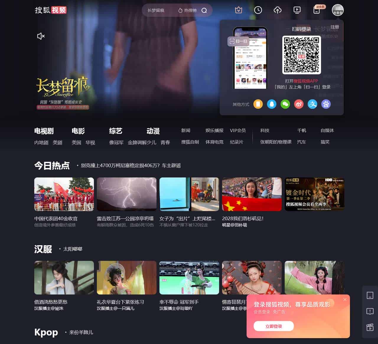 markdown| **类别** | **内容** | |--------------|------------------------------------------------------------------------------------------------------| | **导航** | 电视剧, 电影, 综艺, 动漫, VIP会员, 自媒体, 纪录片, 新闻, 娱乐播报, 体育, 千帆 | | **操作** | 立即开通, 立即登录, 上传作品, 作品管理, 我的频道, 自媒体分成, 免费畅享·超清原画, 视频格式·完美支持, 立即体验PC用户端, 免费领会员, 注册 | | **推荐** | | | 长梦留痕 | 民国少女的残酷成长史 | | 红色使命 | 新一代双枪老太婆智斗敌特 | | 音乐会 | 张垒文淇上演抗战悲歌 | | 金牌调解 | 两地分居二十年妻子落泪求爱 | | 谢谢你来了 | 男子感谢现任妻子改变生活 | | 屌丝男士 | 大咖来袭 爆笑不断 | | 小猪佩奇第10季 | 家庭欢乐剧 新季温馨上线 | | 匆匆那年 | 80后集体的成长记忆 | | **电视剧** | 护卫者, 大客栈, 虎胆巍城, 灿烂的季节, 男人的战争 | | **电影** | 毒液:致命守护者, 万有引力, 安娜, 疯狂的金条, 乐俊凯电影版 | | **综艺** | 一人客栈, 抱走吧!大明星, 金牌调解, 星同事, 韩娱播报 | | **动漫** | 少儿片库, 假面骑士时王, 小狮子赛几, 小猪佩奇第九季 | | **VIP会员** | 新用户首月9.9, 开通会员 | | **自媒体** | 音乐舞蹈, 教育, 搞笑, 游戏, +加入自媒体 | | **纪录片** | 档案(北京卫视), 经典传奇, 这就是中国, 档案(上海纪实频道), 传奇故事2022 | | **直播中** | 张朝阳, 妇产科的陈大夫, 心血管内科张医生 | | **影视** | | | **电视剧** | 内地剧, 美剧 | | **电影** | 美国, 华视 | | **综艺** | 像冠军, 金牌调解 | | **动漫** | 少儿, 青春 | | **新闻** | 娱乐播报 | | **VIP会员** | 搜狐自制 | | **体育电竞** | | | **纪录片** | 科技 | | **千帆** | | | **自媒体** | 排行榜, 张朝阳的物理课 | | **娱乐播报** | | | 巴西一架客机坠毁 | 机上61人全部罹难 | | 别克撞上4700万柯尼塞格定损406万?车主辟谣 | | | 东莞某楼盘推出“买一送一”引关注 | 目前活动已结束 | | **中国代表团40金收官** | | | 雷击致江苏一公园凉亭坍塌 | | | 女子为“出片”上烂尾楼打卡 | | | **2028我们洛杉矶见!** | 明星@田朴珺 | | **“毒玻璃杯”大曝光** | 健康播主@徐昊医生 | | **住宅靠六处,十家九个富** | 国学播主@月涵书舍 | | **一根卫生棉条,超模惨遭截肢** | 知识播主@绝密研究所所长 | | **国风播主** | | | 国风星探官 | | | 太阳嘟嘟 | | | 阿程程 | | | **汉服播主** | | | 借酒浇愁愁更愁 | 汉服播主@妼洙 | | 礼衣华夏台下紧张练习 | 汉服播主@一只满儿 | | 幸不辱命冠军到手 | 汉服播主@玲琅吖 | | 情寄琵琶月下弹 | 汉服播主@亭子欧 | | 金风玉露一相逢 | 汉服播主@笼叶 | | 七夕怎能甘拜下风 | 汉服播主@在下冬小蜜 | | 不才 无名小桃仙罢了 | 汉服播主@猫猫崽 | | **Kpop播主** | | | Kpop狐 | | | 来份羊蹄儿 | | | 树51 | | | 自信女人最秀丽 | Kpop播主@Wii锅酱 | | 夏末就是要跳泫雅的舞 | Kpop播主@Ya是栗子 | | 最甜twice舞 | Kpop播主@阔卡阔卡 | | 又酷又飒!成都路演赛 | Kpop播主@小白不是小黑 | | 超爱这支编舞 | Kpop播主@傲AOAOAO | | 小盆盆的舞都好帅 | Kpop播主@树51 | | 四巡来搜狐咯 | Kpop播主@ZIXIN紫欣 | | **文娱播报** | | | 王晶谈与周星驰决裂 | 跟他有利益冲突就很难做朋友 | | 孙颖莎开启度假模式 | 现身巴黎街头吃冰淇淋 | | 王鹤棣回归《你好星期六》 | 宣传新剧,做手势叮嘱粉丝多喝水好有男友感 | | 孙颖莎代表亚洲吹灭圣火 | | | 汤姆克鲁斯从天而降 | | | 国羽队员兵分几路看演唱会 | | | 高叶穿吊带健身健康又性感 | | | 叶一茜森碟穿马面裙现身巴黎 | | | 曝王思聪已私下认娃 | | | 张兰称大S是主动追求汪小菲 | | | **电视剧** | | | 最新 | 长梦留痕(更新至第16集) | | 最热 | 红色使命(更新至第21集) | | **内地剧** | 姐妹情缘(40集全), 珠江人家(35集全), 天网·行踪(23集全) | | **美剧** | 血族第一季(阴郁的黑暗), 绝命毒师 | | 音乐会 | 烽火连城决(74集全), 楚乔传(32集全), 风雨上海滩(67集全), 那年花开月正圆(30集全) | | **电视剧·排行榜 TOP100** | 血族第一季, 绝命毒师 |