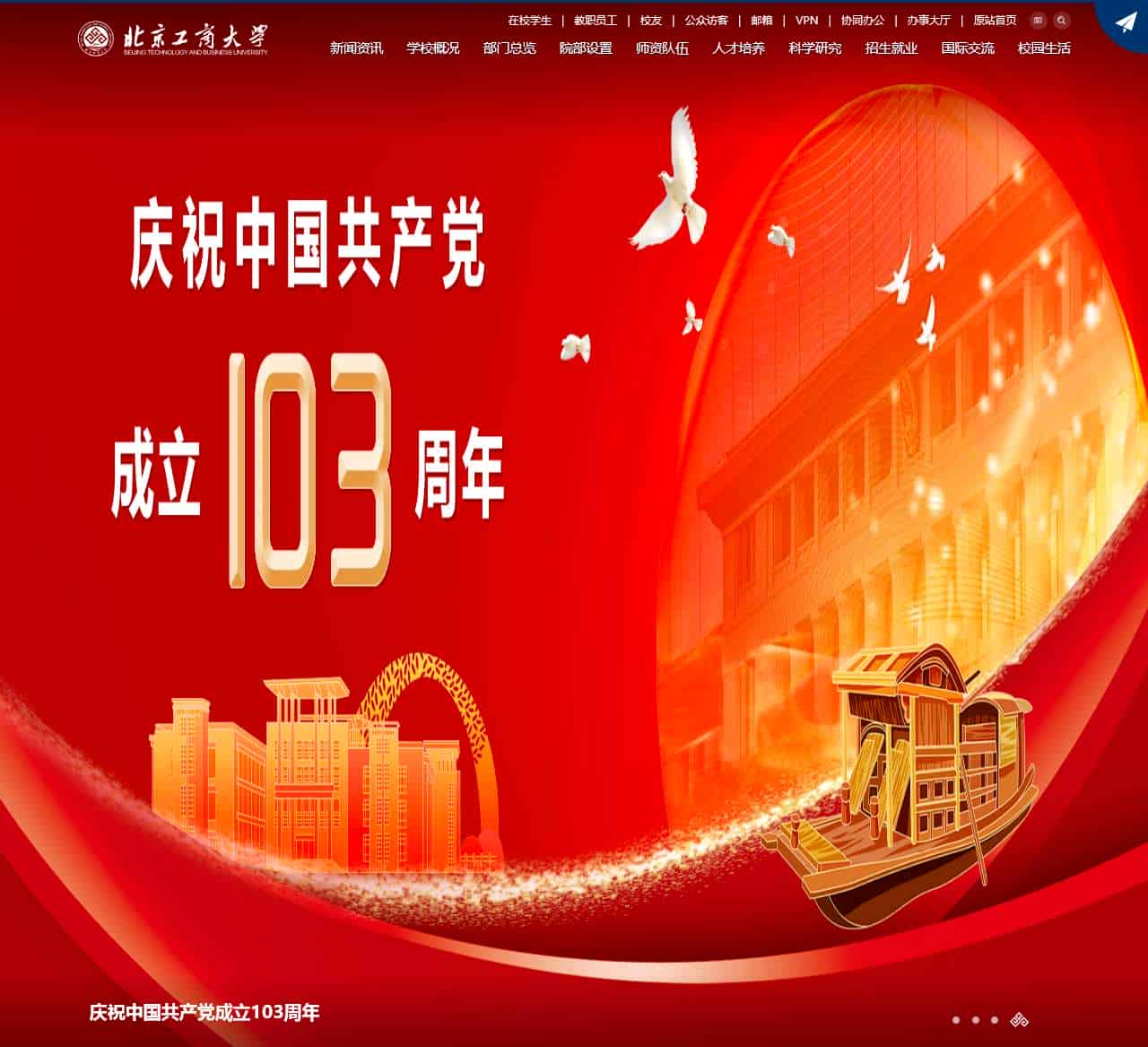 plaintext| 类别 | 内容 | |------------------|------------------------------------------------------------------------------------------| | 在校学生 | 教职员工 校友 公众访客 邮箱 VPN 协同办公 办事大厅 新闻资讯 学校概况 学校简介 学校领导 历史沿革 历任领导 文化标识 部门总览 机关单位 群团组织 教辅单位 院部设置 经管学部 轻工与食品学部 数据科学与人工智能学部 人文社科学部 数字商科实践教学中心 轻工食品类基础课实验教学中心 嘉华学院 国际化妆品学院 师资队伍 师资概况 院士风采 学者风采 导师资源 人才招聘 人才培养 本科生教育 研究生教育 留学生教育 继续教育 科学研究 科研成果 科研项目 学术期刊 研究机构 招生就业 本科生招生 研究生招生 国际教育学院招生 留学生招生 继续教育招生 嘉华学院招生 就业指导中心 国际交流 国际合作交流 中外合作办学 校园生活 学校导游 校园风光 OA办公系统 校历 网络服务 办公信息 服务信息 在校学生 教职员工 校友 公众访客 邮箱 VPN 协同办公 办事大厅 原站首页 | | 新闻资讯 | 庆祝中国共产党成立103周年 出征!北工商学子奔赴祖国山海! 2024年毕业典礼 | 风好正扬帆 奋进正当时 庆祝中国共产党成立103周年 查看更多 北京市委教育工委副书记、市教委主任李奕出席我校审计处与市教委审计处开展的学年调研活动工作会 2024.07.02 转载:中国共产党第二十届中央委员会第三次全体会议公报 2024.07.19 黄先开率团访问美国高校 2024.08.05 北京市高教学会社科学报研究分会第八届会员代表大会在我校召开 2024.07.23 宁波银行北京分行来我校调研交流 2024.07.23 学校举行轻工食品大楼竣工交接仪式 2024.07.02 学校与北京市气象局签署合作协议 2024.07.22 学校召开经济学科建设团队项目研讨会 2024.07.17 北京市委党校(北京行政学院)到我校调研座谈 2024.07.16 我校倪国华教授荣获第九届高等学校科学研究优秀成果奖(人文社会科学)二等奖 2024.08.01 查看更多 “村课”“村播”“村耕”“村晚”,快来看平谷“千人百村”的火热实践! 2024.08.02 这个暑假,北工商青年赋能魅力宁夏! 2024.08.03 数商赋能文旅,赓续井冈薪火,北工商青年走进红色江西 2024.08.09 北工商青年打卡新时代首都“生动实践地”,感悟京华大地上的精神伟力! 2024.07.31 查看更多 | | 通知公告 | 关于开展2024年“法护成长 筑梦未来”法治教育作品征集活动的通知 党委宣传部(新闻中心) 2024.05.09 关于组织开展2025年修缮改造类基础设施改造项目申报工作的通知 公共事务处(学校医院) 2024.08.07 关于开展北京工商大学“数字商科”案例研究项目申报工作的通知 数字商科实践教学中心 2024.08.02 关于开展北京工商大学“数字商科”案例大赛的通知 数字商科实践教学中心 2024.08.02 关于良乡校区东区北门临时封闭的通知 公共事务处(学校医院) 2024.07.31 关于组织开展2025年信息化建设类项目申报工作的通知 网络与信息化管理中心 2024.07.30 | | 招聘与招标 | 人才招聘 更多 招标采购 更多 | | 审核评估 | 【审核评估】学校召开北京工商大学人才培养论证会 2024.06.24 | | 教育教学 | 2024年上半年全国大学英语四、六级考试在我校顺利举行 6月15日,2024年上半年全国大学英语四、六级考试在我校良乡... | | 学科建设 | 学校召开经济学科建设团队项目研讨会 7月15日,我校经济学科建设 |