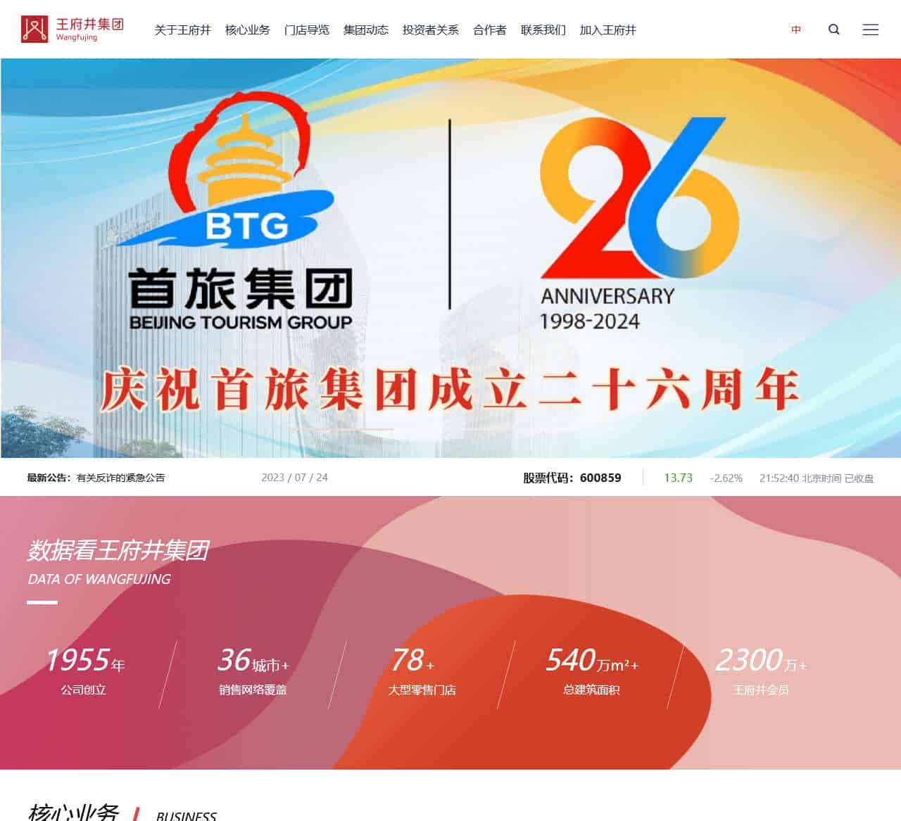 lua| 分类 | 具体内容 | |------------|----------------------------------------------------------------------------------------------| | 集团概况 | 关于王府井集团概况、企业文化、发展历程、获得荣誉、管理团队、新秀项目。 | | 核心业务 | 百货、购物中心、奥特莱斯、超市、免税、自营、线上业务。 | | 门店导览 | 海口市、廊坊市三河市、新乡市、咸阳市、六盘水市、凯里市、遵义市、安顺市、昆明市、绵阳市、巴中市、南充市、眉山市、乐山市、鄂尔多斯市、包头市、呼和浩特市、西宁市、西安市、焦作市、洛阳市、郑州市、贵阳市、万宁市、南昌市、佛山市、东营市、厦门市、武汉市、哈尔滨市、沈阳市、长春市、重庆市、天津市、兰州市、银川市、太原市、成都市、长沙市、北京市。 | | 集团动态 | 查看最新动态、新闻资讯、媒体报道、公告。 | | 最新公告 | 有关假冒网站的紧急公告、有关反诈的紧急公告。 | | 投资者关系 | 投资者关系、合作者、联系我们、加入王府井。 | | 活动动态 | “奥莱盛夏狂欢节”在香江小镇启动、“我在王府井等你!”盘点五一精彩瞬间、王府井×百丽时尚|“遛春天”主题街区启幕、王府井集团&中远海运共议“文旅商融合”,万宁国际免税港接待首批疗休养船员、尚喜平会晤雅诗兰黛集团总裁兼首席执行官、王府井集团获“福布斯2024大消费年度价值企业、影响力零售商”、“共创共赢 逐光成炬”——王府井集团举办合作伙伴答谢会、2024新年祝词:抱赤子之心,燃奋进之路、王府井喜悦购物中心开业 引入71家北京首店、元旦这两家新开的商场火了,背后竟是这个老牌百货集团?、王府井海垦广场焕新揭幕,引入多家首店、高阶生活“新体验”。 | | 相关公告 | 有关反诈的紧急公告、有关假冒网站的紧急公告。 | | 集团合作 | 首旅集团、供应链服务、采购招标平台、集团企业邮箱、集团OA系统、国家商务部、国家发展和改革委员会、中国连锁经营协会、中国百货商业协会。 | | 其他信息 | 网站地图、法律声明、检举举报、京ICP备14025112号-1、京公网安备11040102700006号、网站建设 : 新鸿儒。 |