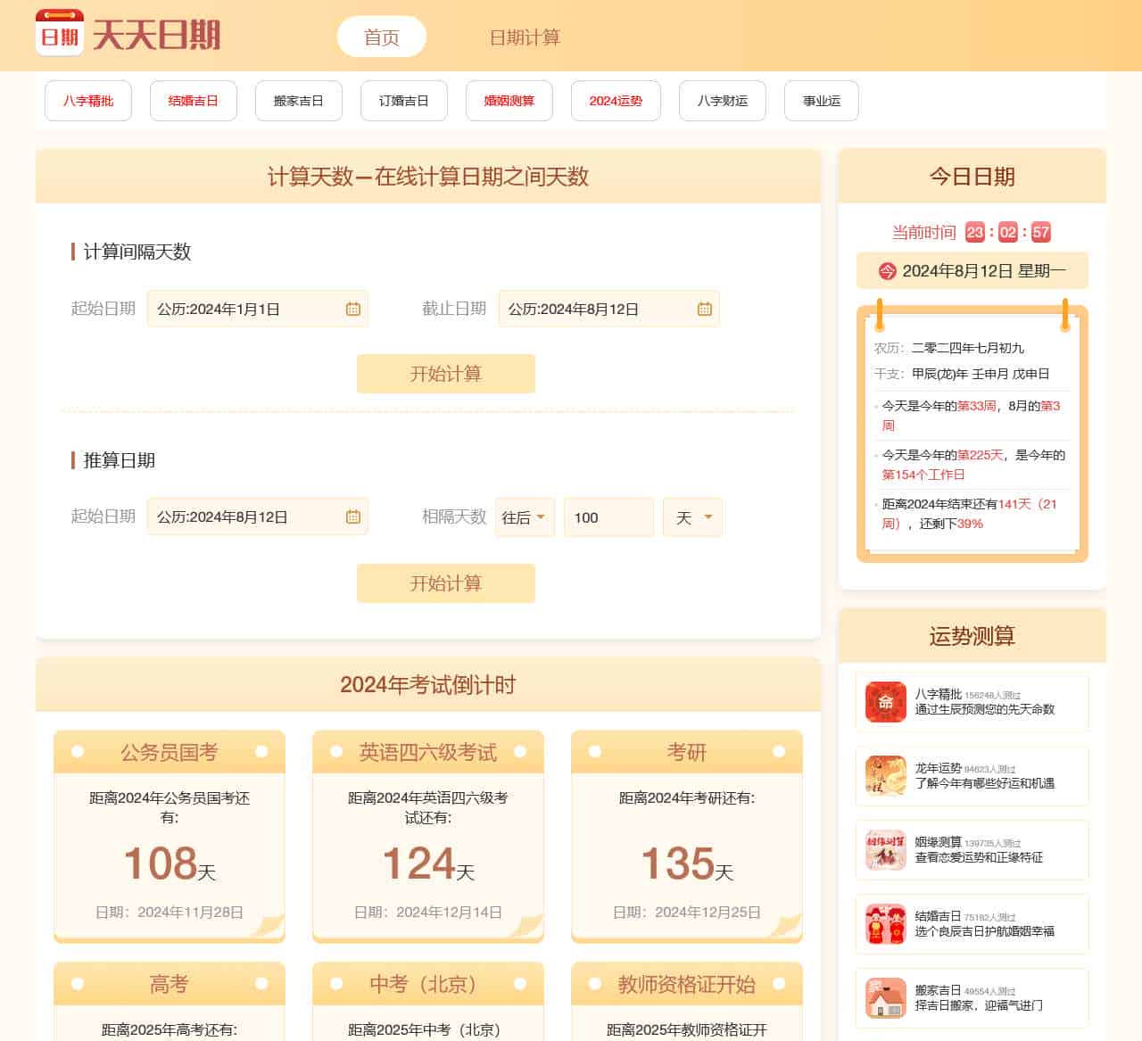 天天日期为您提供:计算天数在线计算、日期天数计算器、时间计算器、倒计时等功能,帮助您在线自动计算转换公历农历日期的间隔天数、年数、月数、周数,可帮您计算有关恋爱结婚、生日纪念日、考试的等事件的天数日期。