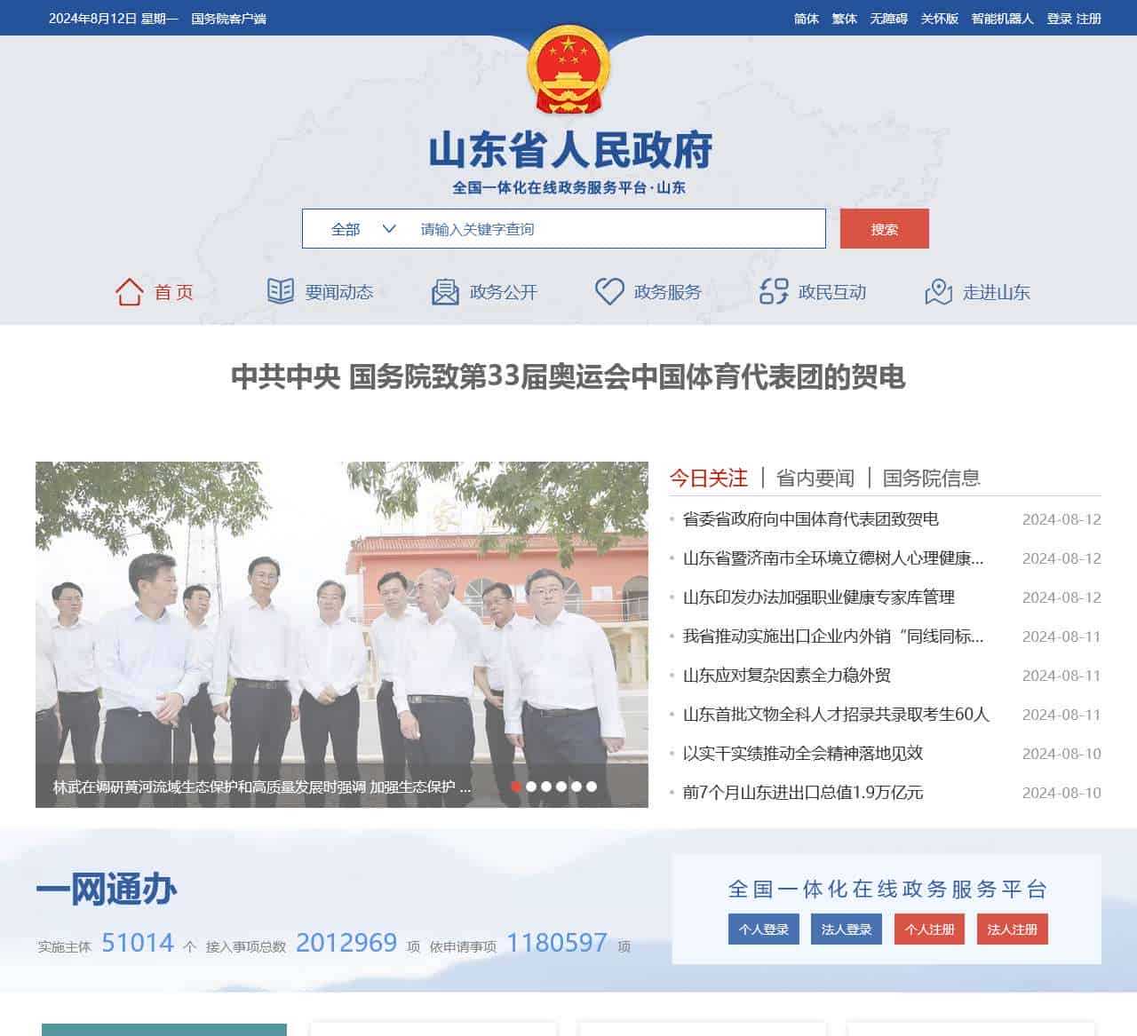 plaintext┌───────────────────────────────────────────────────────────────────────────────┐ │ 国务院用户端 │ ├───────────────────────────────────────────────────────────────────────────────┤ │ 简体 繁体 无障碍 关怀版 退出关怀版 创建桌面图标 │ │ 智能机器人 │ │ 登录 个人登录 法人登录 注册 个人注册 法人注册 │ ├───────────────────────────────────────────────────────────────────────────────┤ │ 首 页 要闻动态 政务公开 政务服务 政务督查 政民互动 走进山东 │ ├───────────────────────────────────────────────────────────────────────────────┤ │ 中共中央 国务院致第33届奥运会中国体育代表团的贺电 │ ├───────────────────────────────────────────────────────────────────────────────┤ │ 林武在调研黄河流域生态保护和高质量发展时强调 加强生态保护 保障黄河安澜 为落实黄河重大国家战略作出更大贡献 │ │ │ │ 周乃翔主持召开省政府常务会议 │ │ │ │ 省政府新闻办举行新闻发布会,介绍山东完善公共安全治理体系,开展打击电信网络诈骗违法犯罪三年行动工作成效 │ │ │ │ 山东省级问政平台 问政山东 │ │ │ │ @国务院 我来说 │ │ │ │ 关于征集影响营商环境建设问题线索的公告 │ ├───────────────────────────────────────────────────────────────────────────────┤ │ 今日关注 省内要闻 国务院信息 │ ├───────────────────────────────────────────────────────────────────────────────┤ │ 省委省政府向中国体育代表团致贺电 │ │ │ │ 山东省暨济南市全环境立德树人心理健康宣传教育活动启动 │ │ │ │ 山东印发办法加强职业健康专家库管理 │ │ │ │ 我省推动实施出口企业内外销“同线同标同质”工程,“三同”企业... │ │ │ │ 山东应对复杂因素全力稳外贸 │ │ │ │ 山东首批文物全科人才招录共录取考生60人 │ │ │ │ 以实干实绩推动全会精神落地见效 │ │ │ │ 前7个月山东进出口总值1.9万亿元 │ │ │ │ 山东基层治理“小马拉大车”突出问题专项整治进入聚焦整治阶段 │ │ │ │ 我省一案例入选质量认证服务产业高质量发展优秀案例 │ │ │ │ 推进移风易俗 倡树婚俗新风 │ │ │ │ 20个县市区将开展县域数字农业发展县建设 │ │ │ │ 我省开展打击治理电诈犯罪三年行动 │ │ │ │ 山东治理电视“套娃”收费和操作复杂问题取得成效 │ │ │ │ 山东印发通知规范民办高校收费 │ │ │ │ 山东公布17家重点行业省级水效领跑者企业 │ ├───────────────────────────────────────────────────────────────────────────────┤ │ 中共中央 国务院关于加快经济社会发展全面绿色转型的意见 │ │ 国务院批复同意《中新天津生态城建设国家绿色发展示范区实施方案(2024—2035年)》 │ │ 国务院批复同意海南省人民政府暂时行使有关行政审批权限 │ │ 国务院印发《关于促进服务消费高质量发展的意见》 │ │ 国办印发《加快构建碳排放双控制度体系工作方案》 │ │ 退役军人安置条例(全文) │ │ 国办印发《关于健全基本医疗保险参保长效机制的指导意见》 │ │ 国务院印发《深入实施以人为本的新型城镇化战略五年行动计划》 │ │ 中华人民共和国保守国家秘密法实施条例(全文) │ │ 国办印发《“高效办成一件事”2024年度新一批重点事项清单》 │ │ 国务院批复同意在沈阳等6个城市暂时调整实施有关行政法规和经国务院批准的部门规章规定 │ │ 国办转发《关于进一步做好资本市场财务造假综合惩防工作的意见》 │ │ 国办印发《政府采购领域“整顿市场秩序、建设法规体系、促进产业发展”三年行动方案(2024—2026年)》 │ │ 国务院关于实施《中华人民共和国公司法》注册资本登记管理制度的规定(全文) │ │ 稀土管理条例(全文) │ │ 中共中央 国务院关于2023年度国家科学技术奖励的决定 │ │ 国办印发《促进创业投资高质量发展的若干政策措施》 │ │ 中办国办印发《关于做好全国民族团结进步模范推荐评选工作的通知》 │ │ 国办转发《教育部直属师范大学本研衔接师范生公费教育实施办法》 │ │ 公平竞争审查条例(全文) │ │ 国办印发《深化医药卫生体制改革2024年重点工作任务》 │ │ 国务院关于修改《