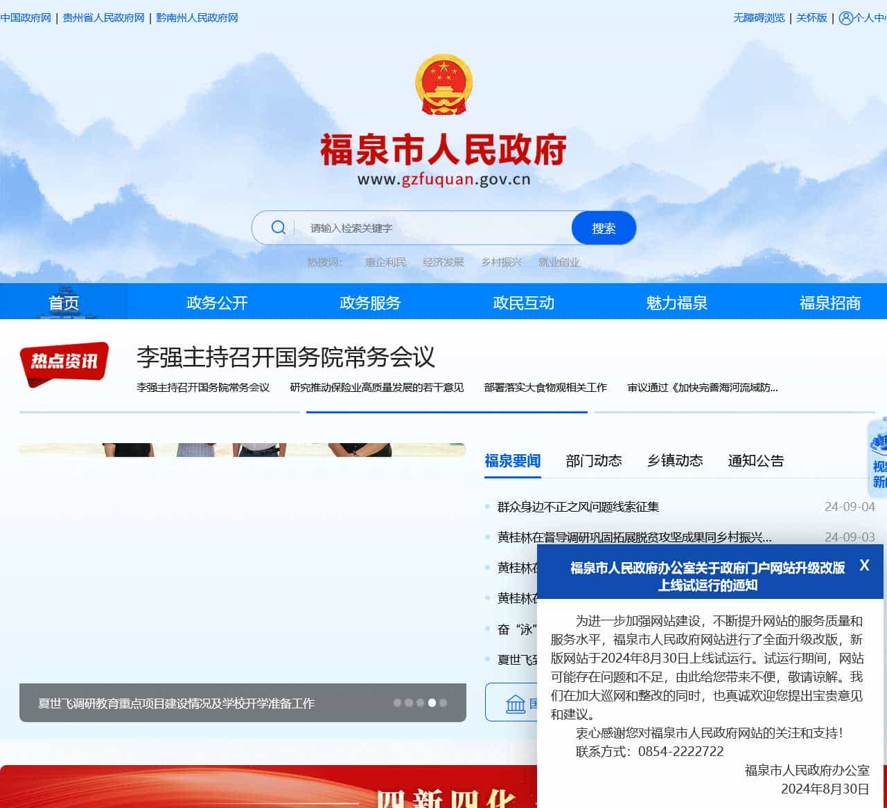 markdown| **栏目** | **内容** | |----------------|--------------------------------------------------------------------------------------------------------| | **网站名称** | 欢迎访问福泉市人民政府 | | **日期** | 2024年08月28日 星期三 | | **RSS订阅** | 设为首页 加入收藏 下午好,请登录 | | **菜单** | 首 页 新闻动态 政务公开 解读回应 互动交流 在线服务 魅力福泉 福泉招商 专题专栏 | | **通知公告** | 福泉市人力资源和社会保障局关于乡村公益性岗位(就业援助)人员... | | | [详情] | | | 贵州省福泉市2024年面向社会公开引进卫生健康系统高层次和急需紧... | | | [详情] | | | 福泉市2024年8月份公开招聘城镇公益性岗位公告 | | | [详情] | | | 福泉市2024年第五批技能培训补贴及鉴定补贴发放公示 | | | [详情] | | | 福泉市人力资源和社会保障局关于福泉市2024年第四批“证书直补”... | | | [详情] | | | 贵州省福泉市2024年面向社会公开引进教育系统高层次人才拟聘人员... | | | [详情] | | | 福泉市事业单位2021年下半年应征入伍大学生退役士兵聘用情况公示 | | | [详情] | | | 福泉市人力资源和社会保障局关于2024年就业帮扶车间认定的公示 | | | [详情] | | | 福泉市人力资源和社会保障局关于城镇公益性岗位拟聘用人员公示 | | | [详情] | | | 福泉市人力资源和社会保障局关于福泉市2024年第八批单位申请2023-... | | | [详情] | | | 福泉市人力资源和社会保障局关于乡村公益性岗位(就业援助)人员... | | | [详情] | | | 贵州省福泉市2024年面向社会公开引进卫生健康系统高层次和急需紧... | | | [详情] | | **新闻动态** | 黄桂林在督导调研新型工业化重大项目建设工作时强调:发展新质生产力 跑出福泉“加速度” | | | [详情] | | | 黄桂林在督导调研重大项目建设工作时强调:“干”字当头显担当 奋勇争先有作为 | | | [详情] | | | 福泉市高质量建设强富美新福泉表彰会暨2024年经济工作会议召开 黄桂林主持并讲话 | | | [详情] | | | 市委常委会召开扩大会议 传达学习近期重大会议及文件精神 安排部署贯彻落实工作 | | | [详情] | | | 【红土地 双拥情】军政同心 共卫国防 福泉市举行2024年“八一”文艺晚会 | | | [详情] | | | 黄桂林在督导调研新型工业化重大项目建设工作时强调:发展新质生产力 跑出福泉“加速度” | | | [详情] |