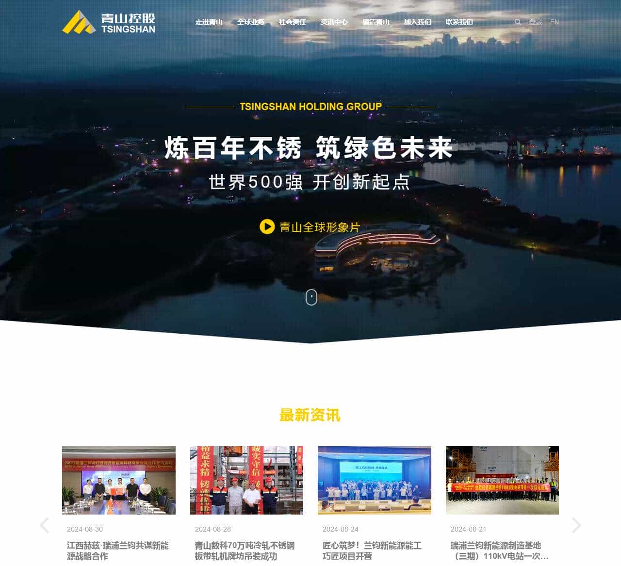 | 走进青山 | 集团简介 集团荣誉 影像集锦 全球业务 不锈钢制造 新能源产业链 创新与发展 社会责任 生态环保 慈善公益 |