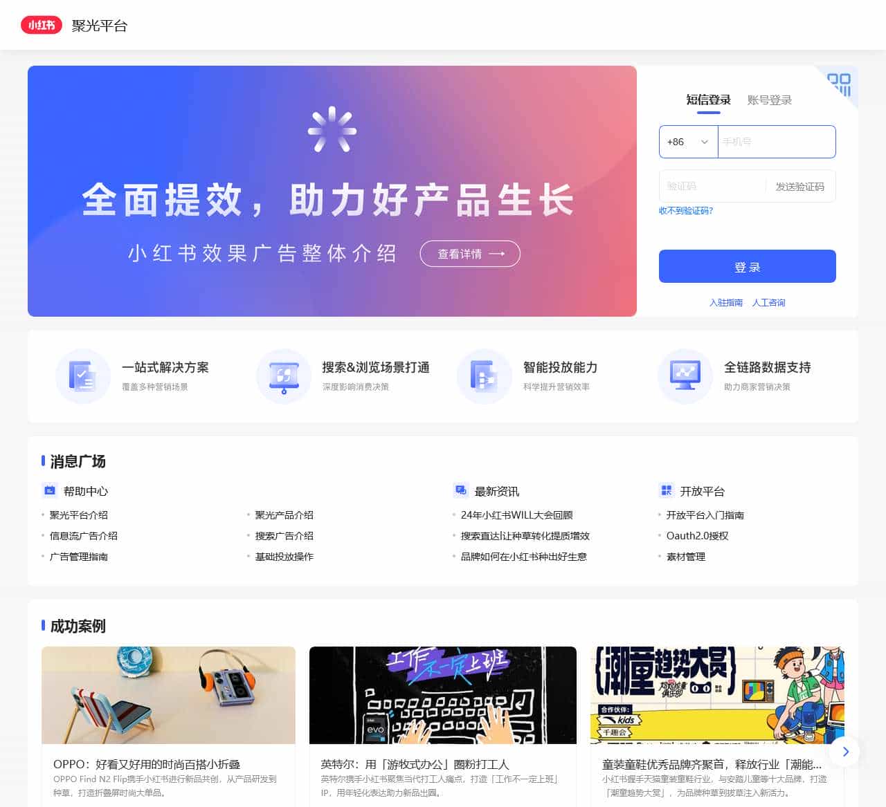 聚光平台是小红书营销的一站式广告投放平台,能够满足广告主以“产品种草、商品销量、客资收集、直播推广、抢占赛道”为目标的多样化营销诉求。平台打通了搜索和浏览两大用户关键决策场景,并支持以SPU(产品)为颗粒度的精准定向和智能投放能力,为广告主提供一体化的营销解决方案,让好产品自然发光。